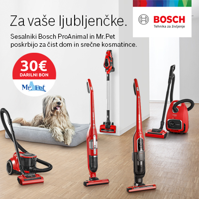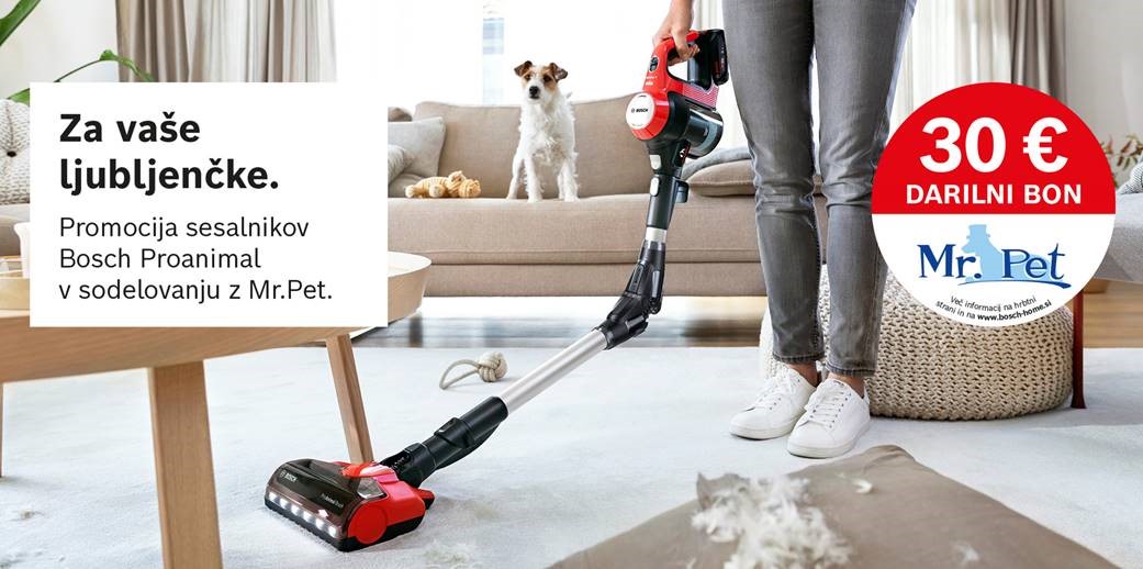 Uspešno promocijo sesalnikov Bosch ProAnimal “Za vaše ljubljenčke.”, ki se je pričela 1. 10. 2021, smo podaljšali do 31. 12. 2023. V okviru te promocije prejmejo kupci akcijskih modelov ob nakupu, registraciji in oceni aparata v portalu MyBosch prejme darilne bone Mr. Pet v vrednosti 30€. V primeru težav nas lahko pokličete na 080 1619, kjer smo dosegljivi od ponedeljka do petka med 7. in 20. uro.