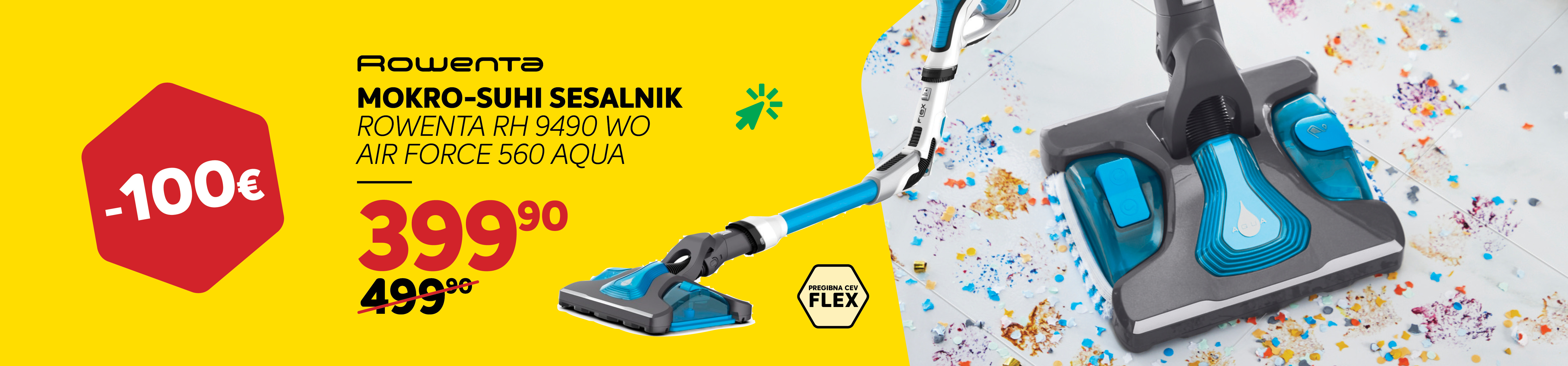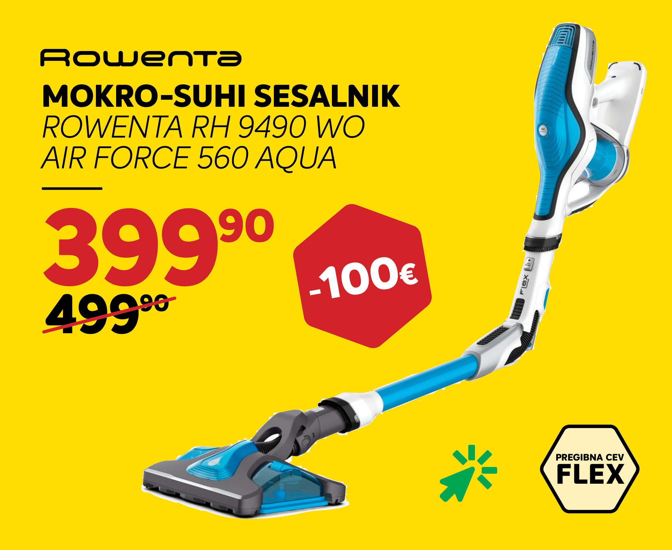 Vse omenjene kriterije denimo izpolnjuje pokončni sesalnik Rowenta AIR FORCE FLEX AQUA 560 RH9490, ki omogoča klasično sesanje, mokro čiščenje tal, doseže strope, je kos umazaniji na delovnih površinah kakor tudi tisti, ki je ujeta v špranje foteljev. Poglejmo nekaj njegovih ključnih lastnosti: