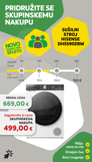 Ne kupujte sami, kupujte v ekipi! Pridružite se skupinskemu nakupu sušilnega stroja Hisense DH5S902BW in s svojo prijavo pomagajte odkleniti naslednji nivo popusta.