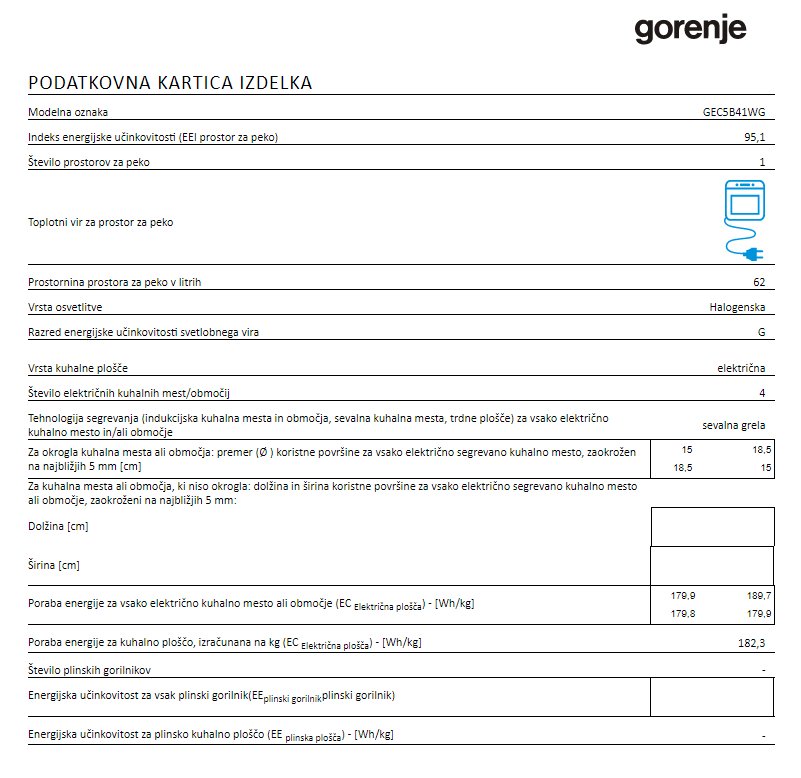 Steklokermaični štedilnik Gorenje - GEC5B41WGNačin postavitve: Prostostoječ, Širina izdelka: 50 cm, Višina izdelka: 85 cm, Razred energijske učinkovitosti: A, Mehanski izklopni minutnik