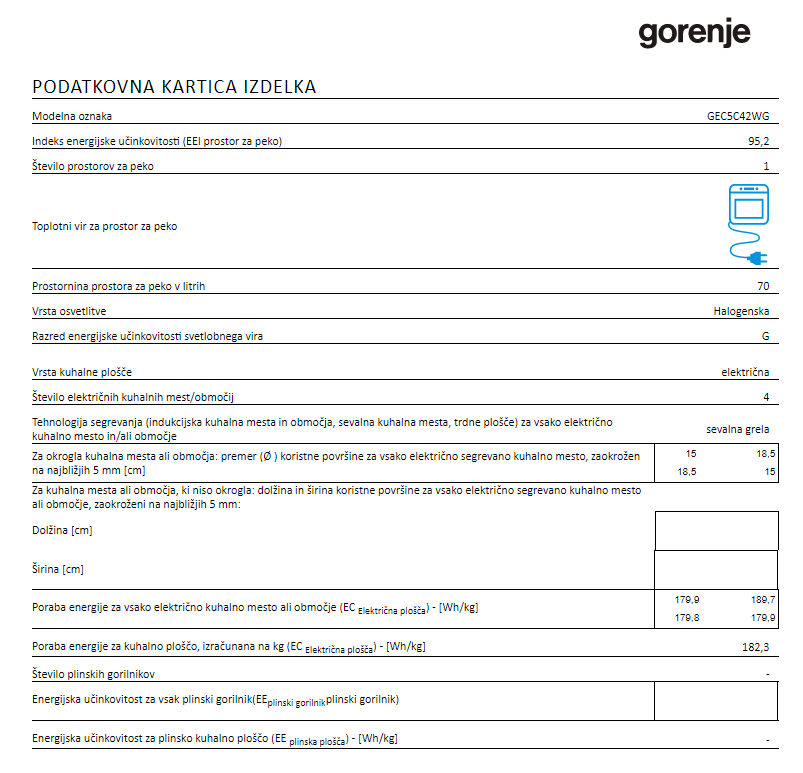 Blagovna znamka GORENJE ENERGIJSKI RAZRED A VRSTA KUHALIŠČA STEKLOKERAMIKA VRSTA PEČICE VEČSISTEMSKA PROSTORNINA PEČICE 70 L ZASTEKLITEV VRAT DVOJNA ŠIRINA 50 CM GLOBINA 59,4 CM BARVA BELA VIŠINA 85 CM GARANCIJA V LETIH 5 Mnenja