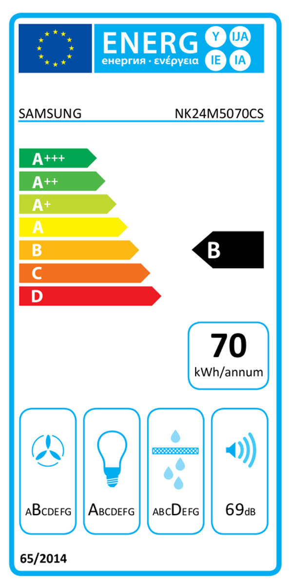 Blagovna znamka SAMSUNG LETNA PORABA ENERGIJE 70 KWH UPRAVLJANJE ELEKTRONSKO RAZRED UČINKOV. PRETOKA ZRAKA B ŠIRINA 60 CM RAZRED UČINKOV. OSVETLJEVANJA A VRSTA NAPE STENSKA RAZRED UČINKOV. FILTR. MAŠČOB D PRETOK ZRAKA DO 670 M3/H GLASNOST DELOVANJA 69 DB BARVA INOX-STEKLO ENERGIJSKI RAZRED B GARANCIJA V LETIH 2 LETI -