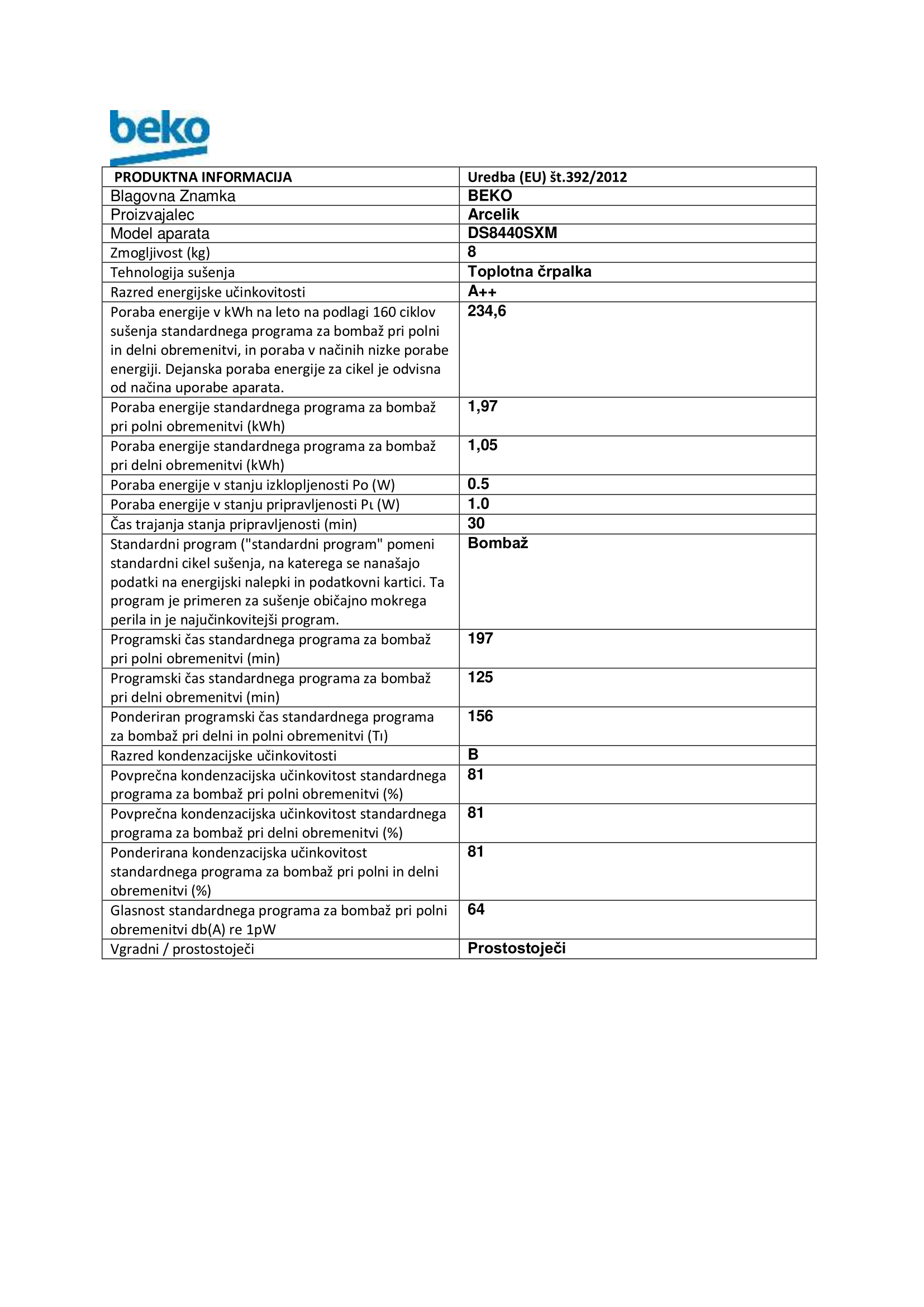 SUŠILNI STROJ BEKO DS8440SXM TOPLOTNA ČRPALKA