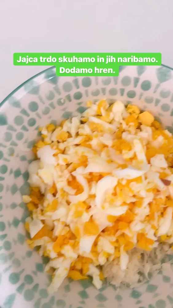 Jajca in hren nastrgamo (jajca lahko tudi sesekljamo z nožem) in damo v posodico. Dodamo bučno olje, kis, malo vode in sol, ter dobro premešamo. Vodo dodajamo po občutku – najprej malo in po potrebi še dodamo, da dobimo lepo kremasto strukturo.