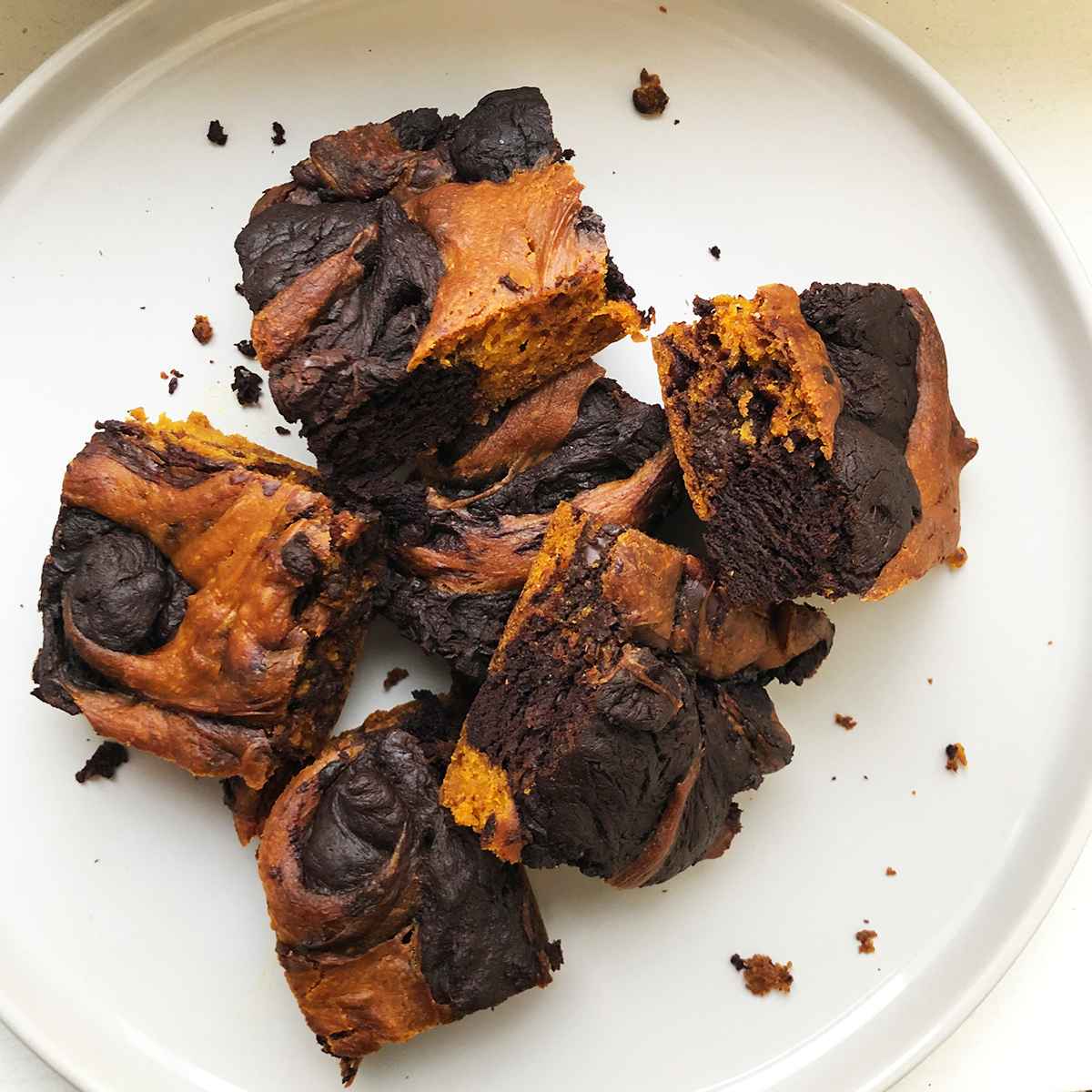 Bučo očistimo in narežemo na večje kose, damo v posodo za kuhanje in dodamo 0,5 dl vode. Pristavimo na štedilnik, zavremo, potem zmanjšamo ogenj, da se počasi kuha še približno 10 - 15 min. Malo ohladimo in zmeljemo v posodici paličnega mešalnika ali blenderju. Lahko jo tudi enostavno zmečkamo z vilico. Tako dobimo bučni pire, ki ga damo v posodo, v katero smo že prej dali na koščke narezano maščobo in sladkor. Počakamo, da se maščoba stopi in vse skupaj premešamo z lopatko. Dodamo še suhe sestavine (moko, kakav in sodo bikarbono) in premešamo z lopatko, na koncu vmešamo še narezano čokolado. Manjši pekač (velikosti približno 25x15 cm) obložimo s papirjem za peko in nanj razporedimo maso. Pečemo 30 min na 180 C.