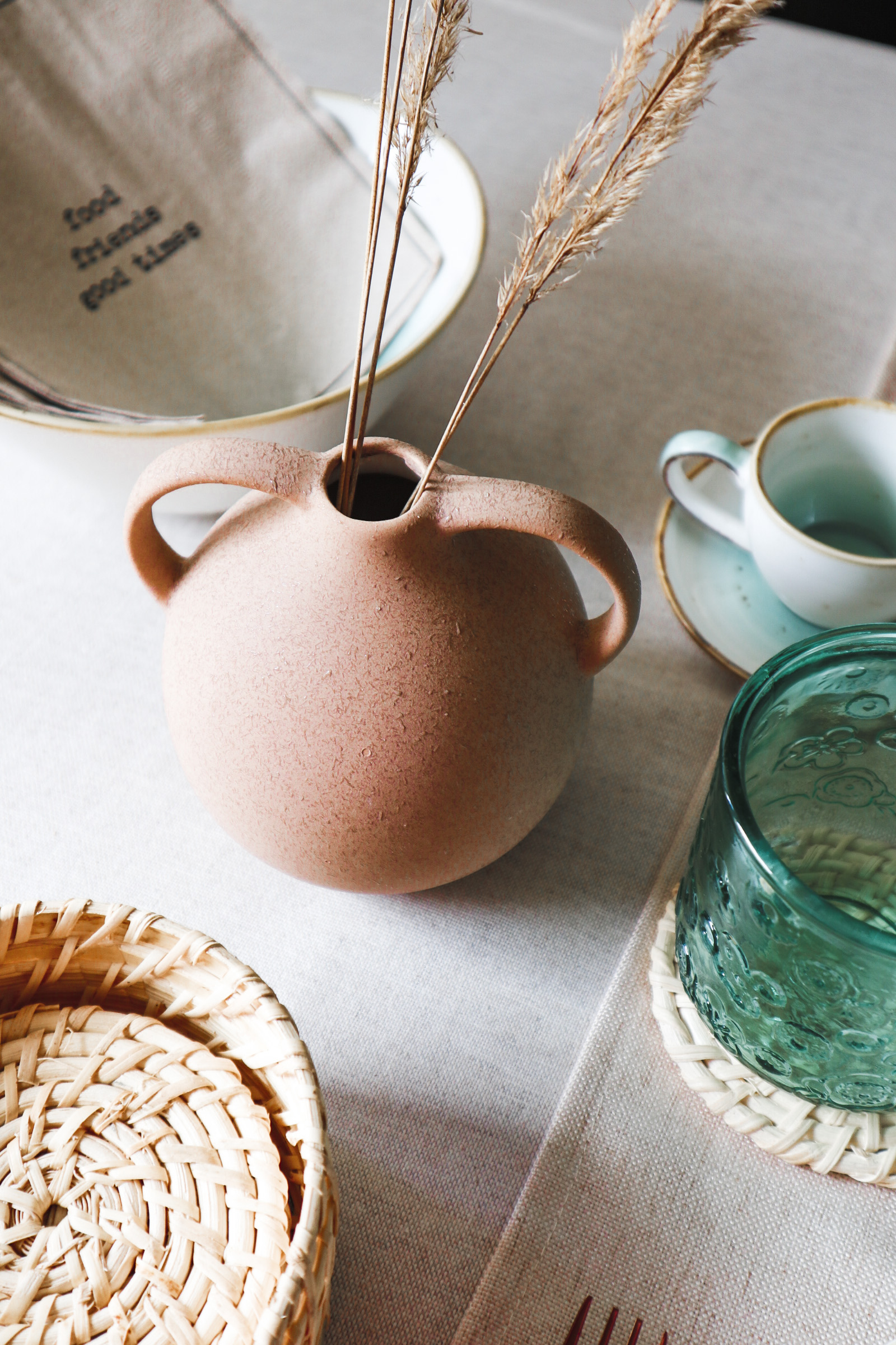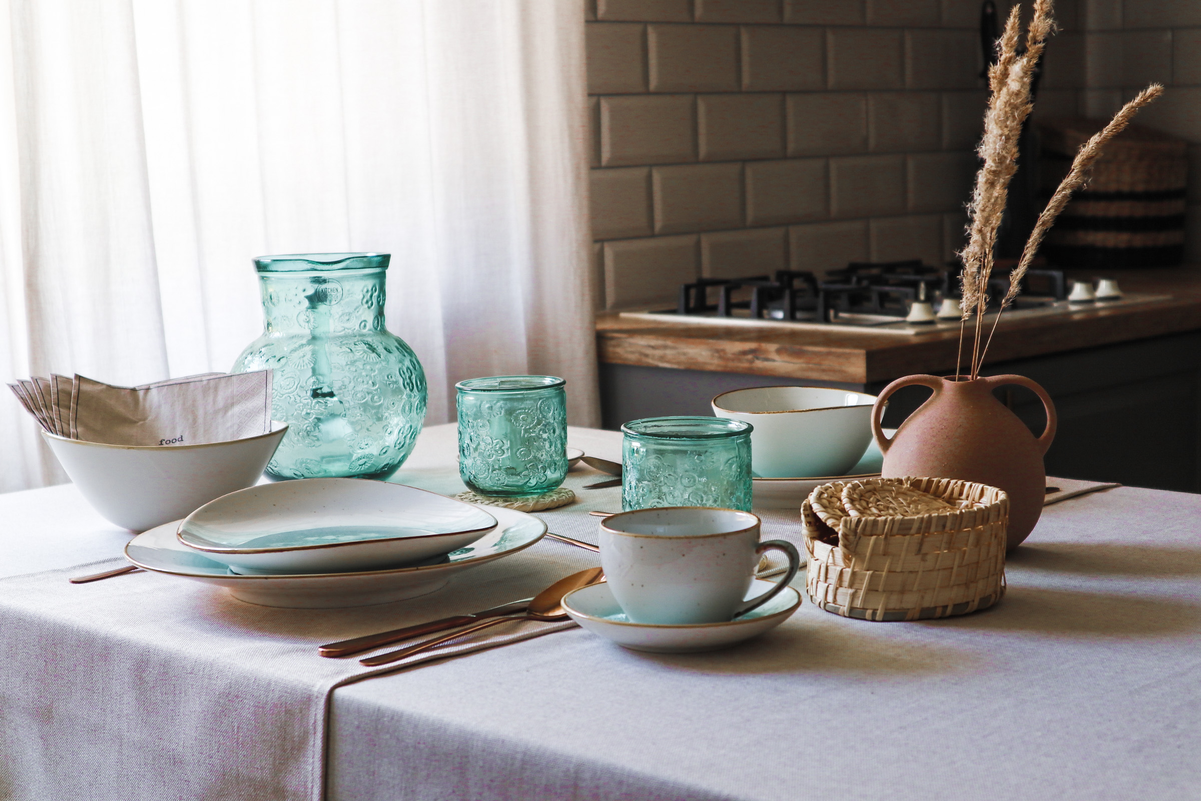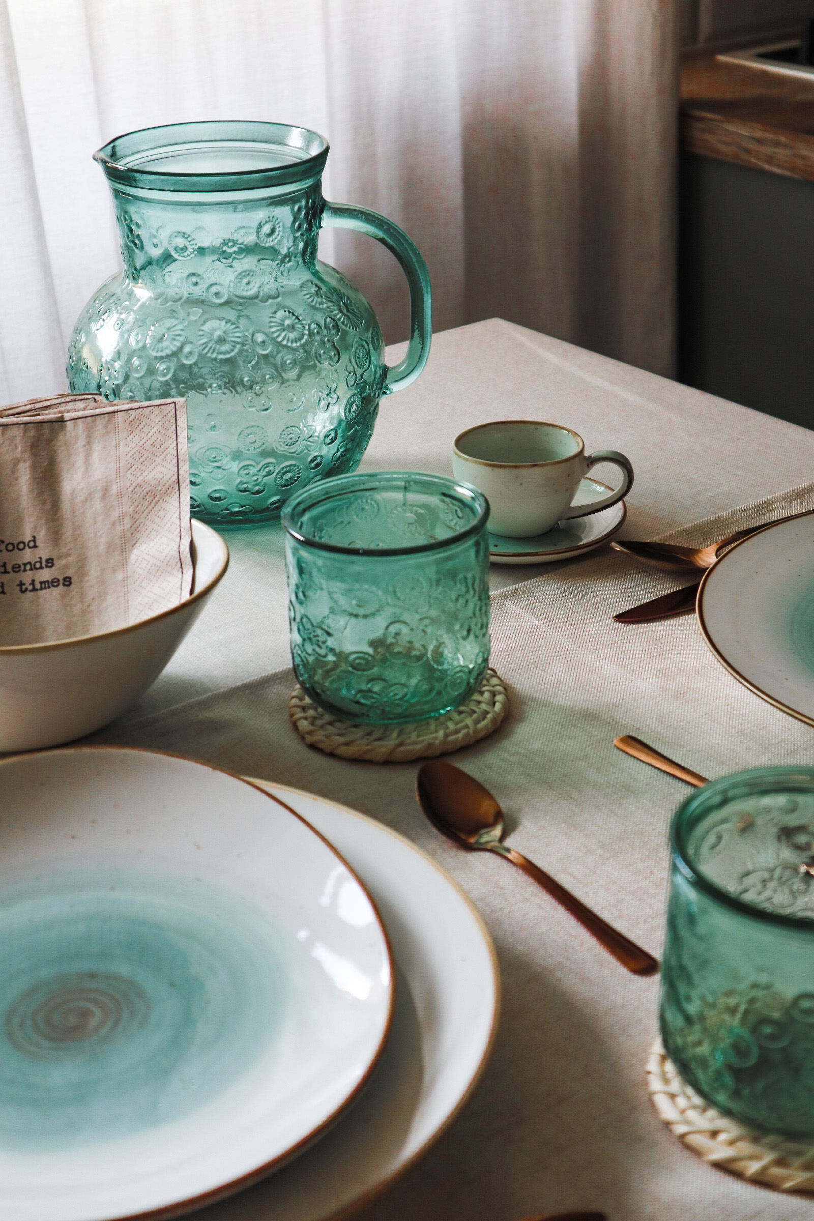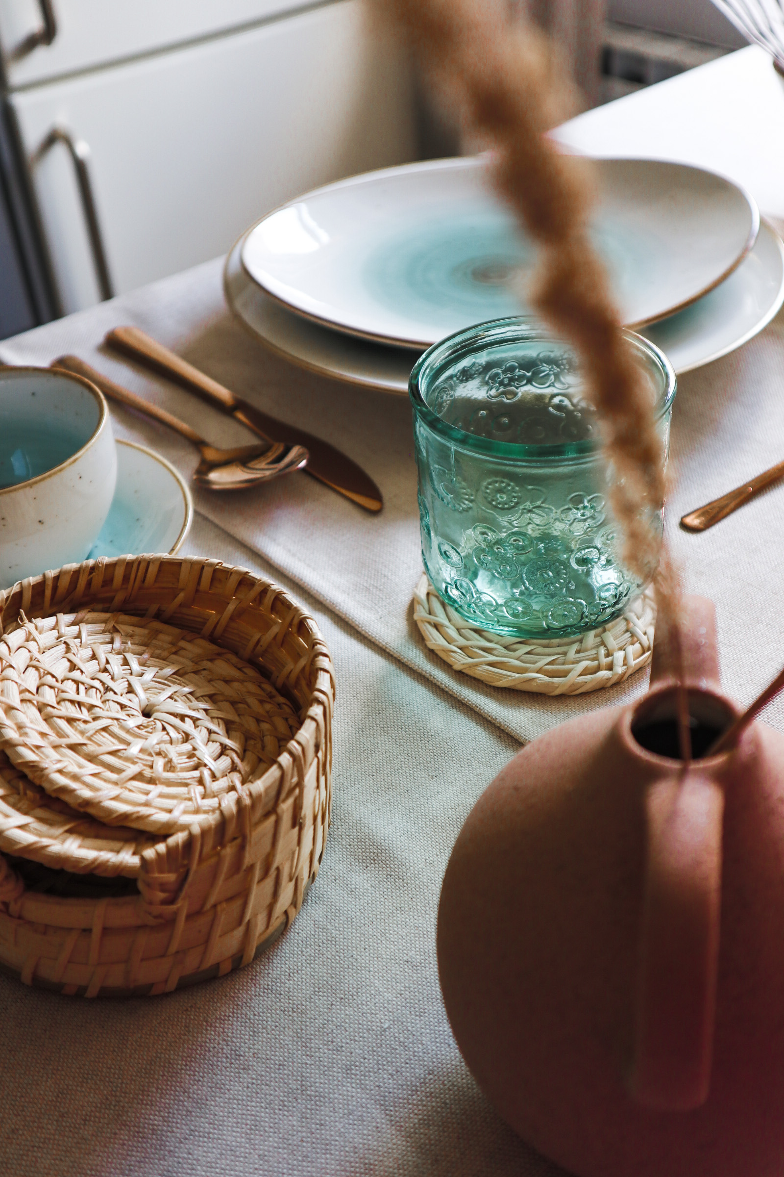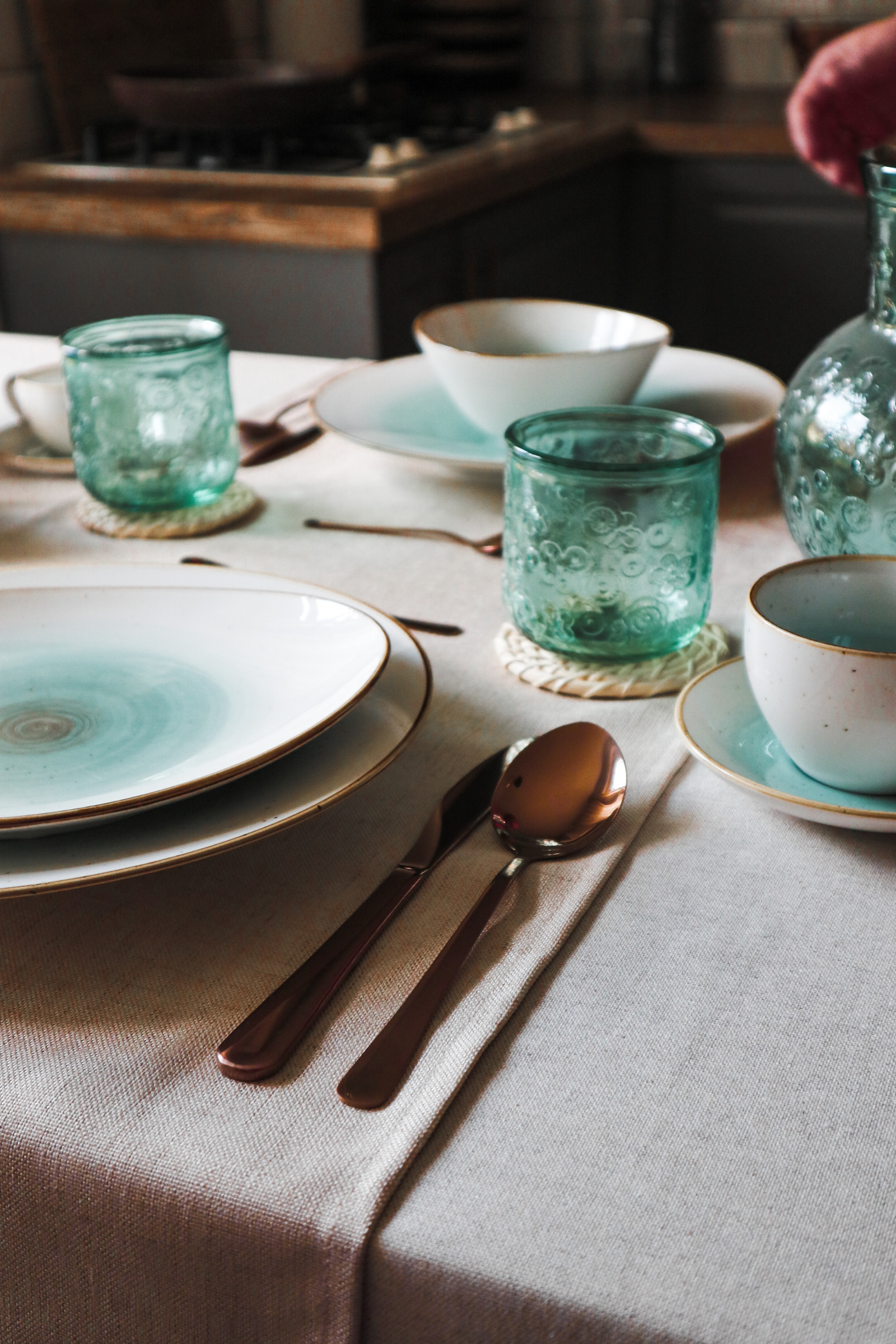 Te krožnike sem zagledala že od daleč in vedela sem, da jih moram vključiti. Kombinacija servisa v zeleno-turkizni in beli z bakrenimi robovi kar kliče po priboru v bakreni barvi. Dodala sem še komplet steklenega vrča in kozarcev v zeleni barvi, potem pa vse skupaj prizemljila z naravnimi podstavki, keramično vazo s suhimi travami in prtom ter tekačem v naravnem izgledu.