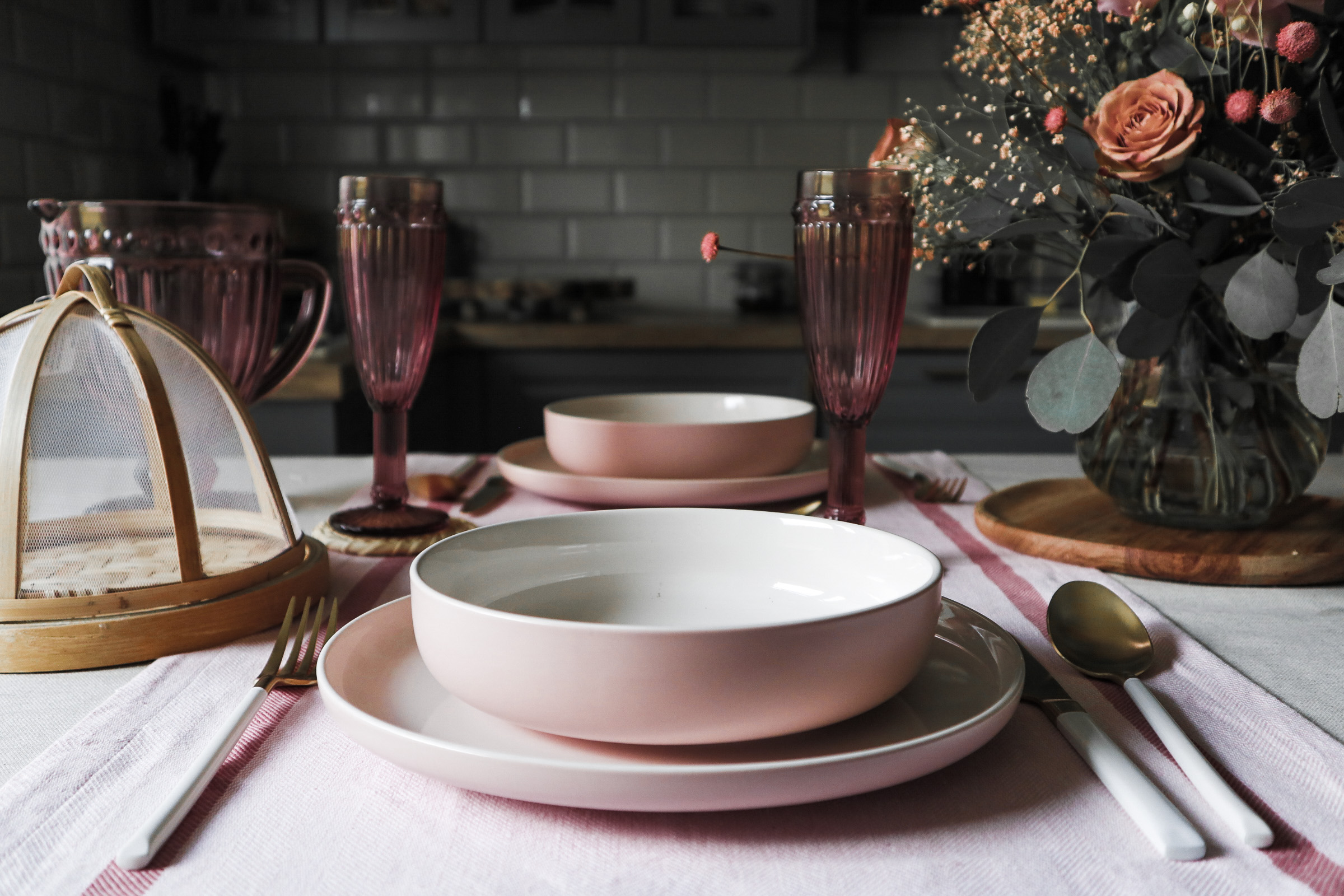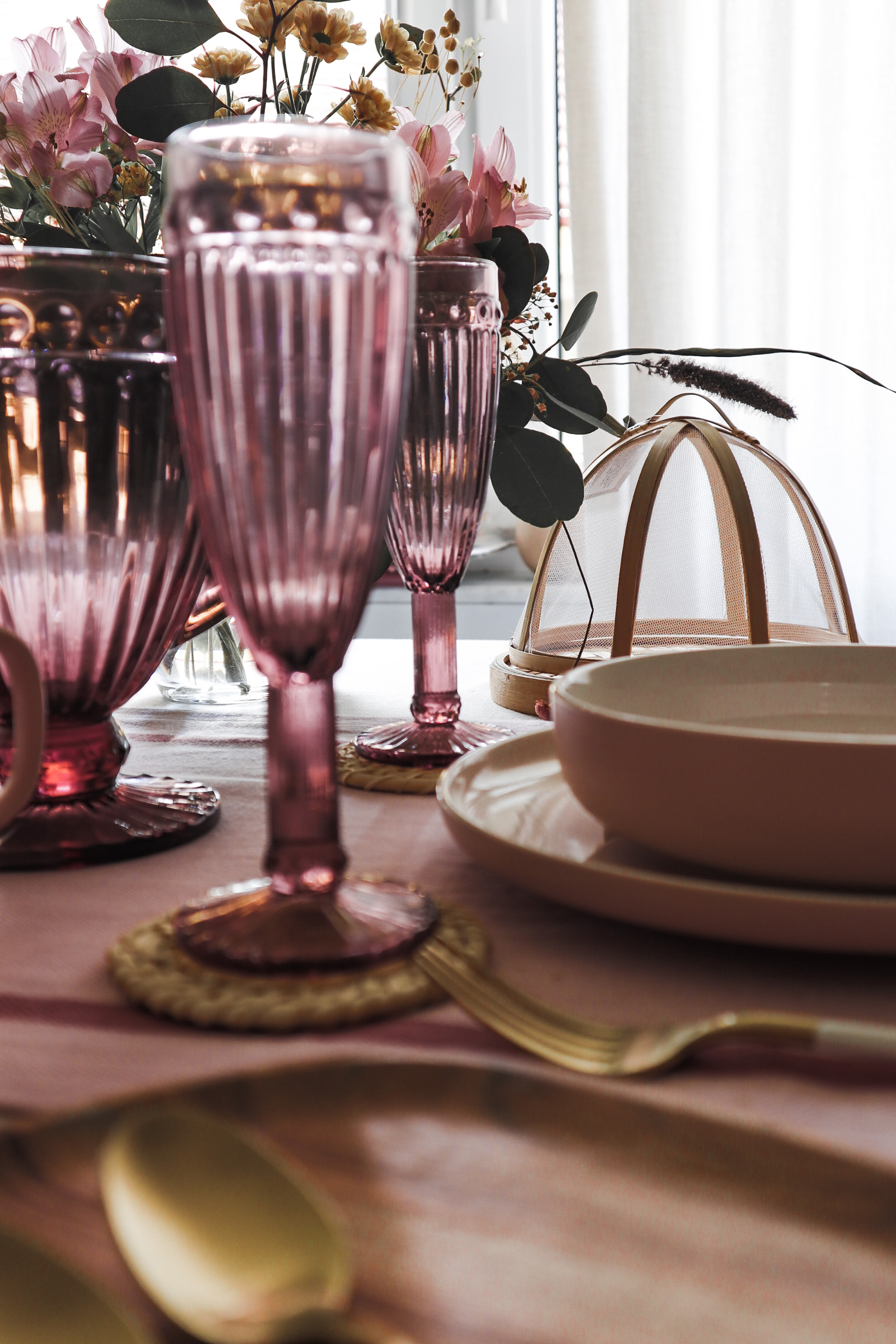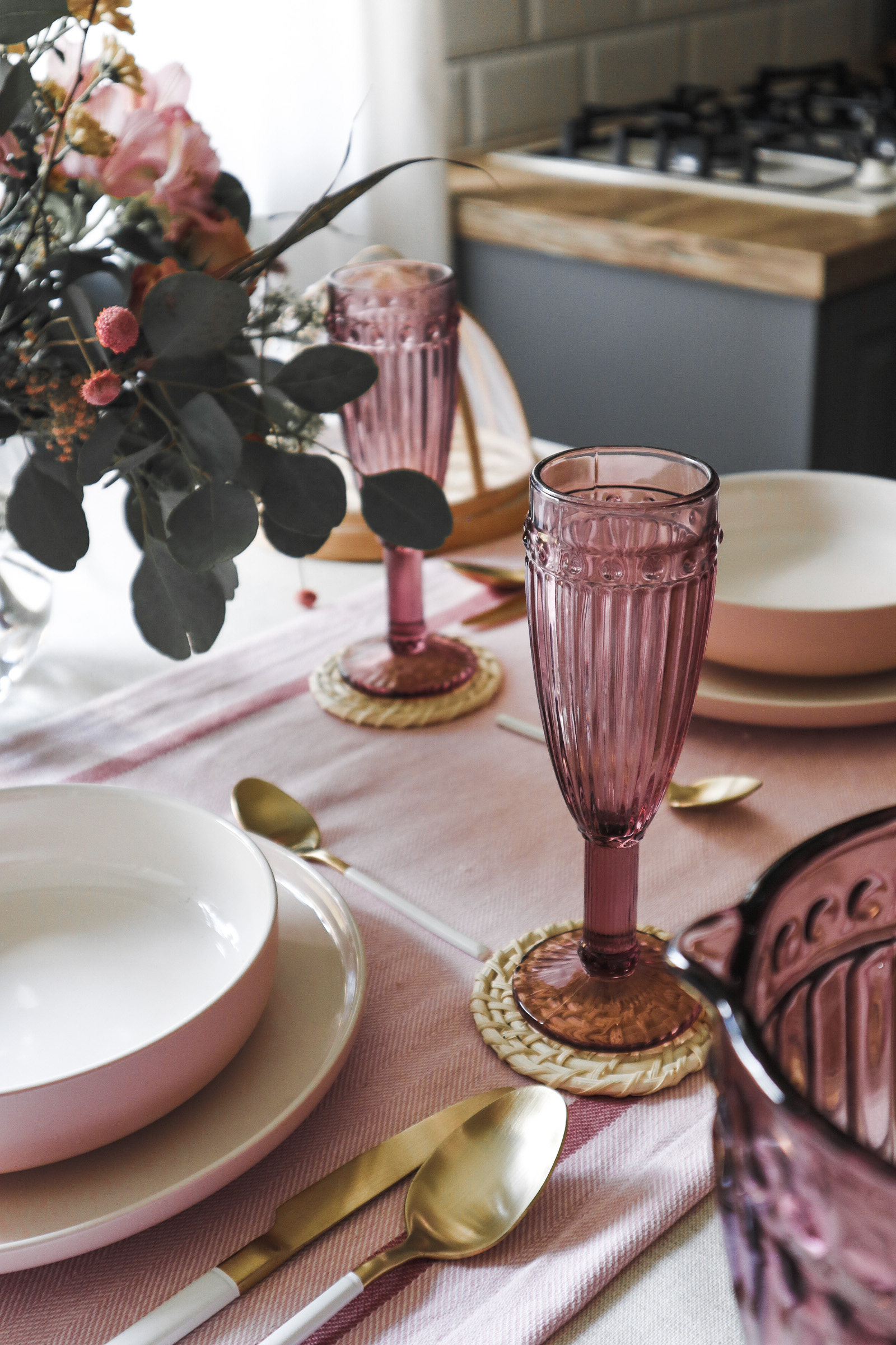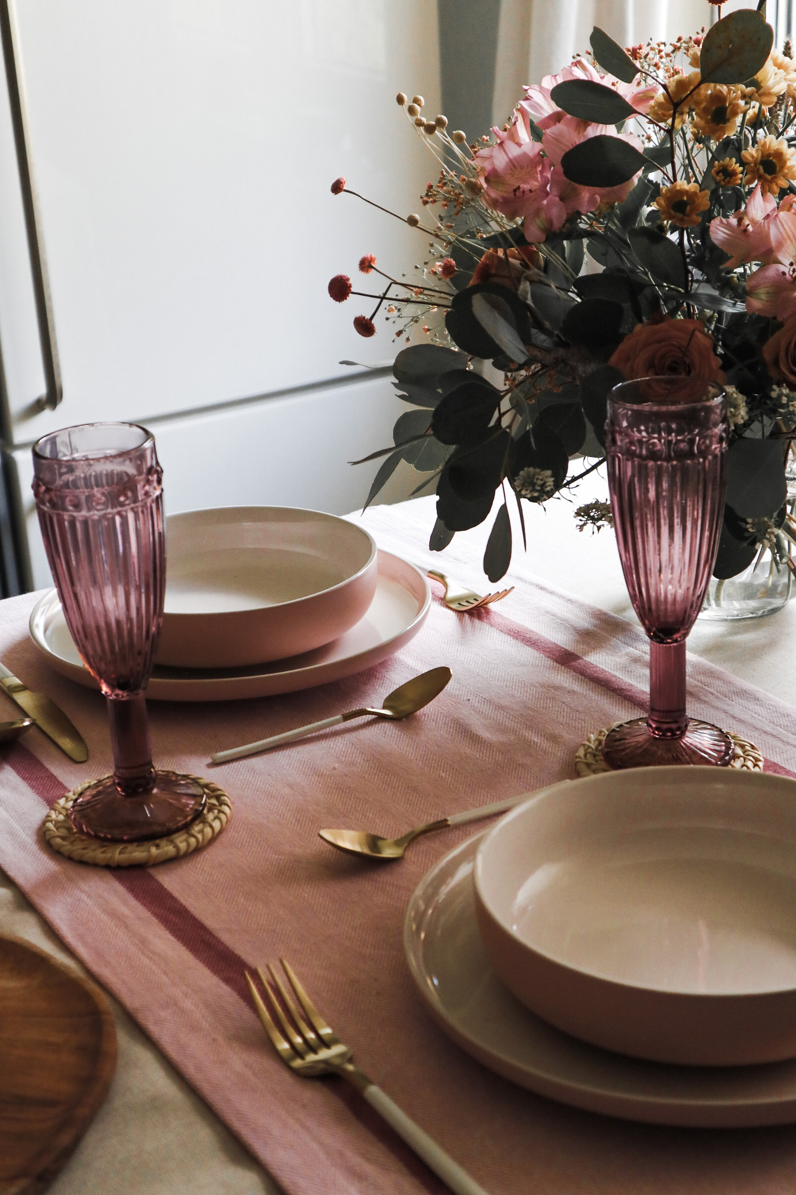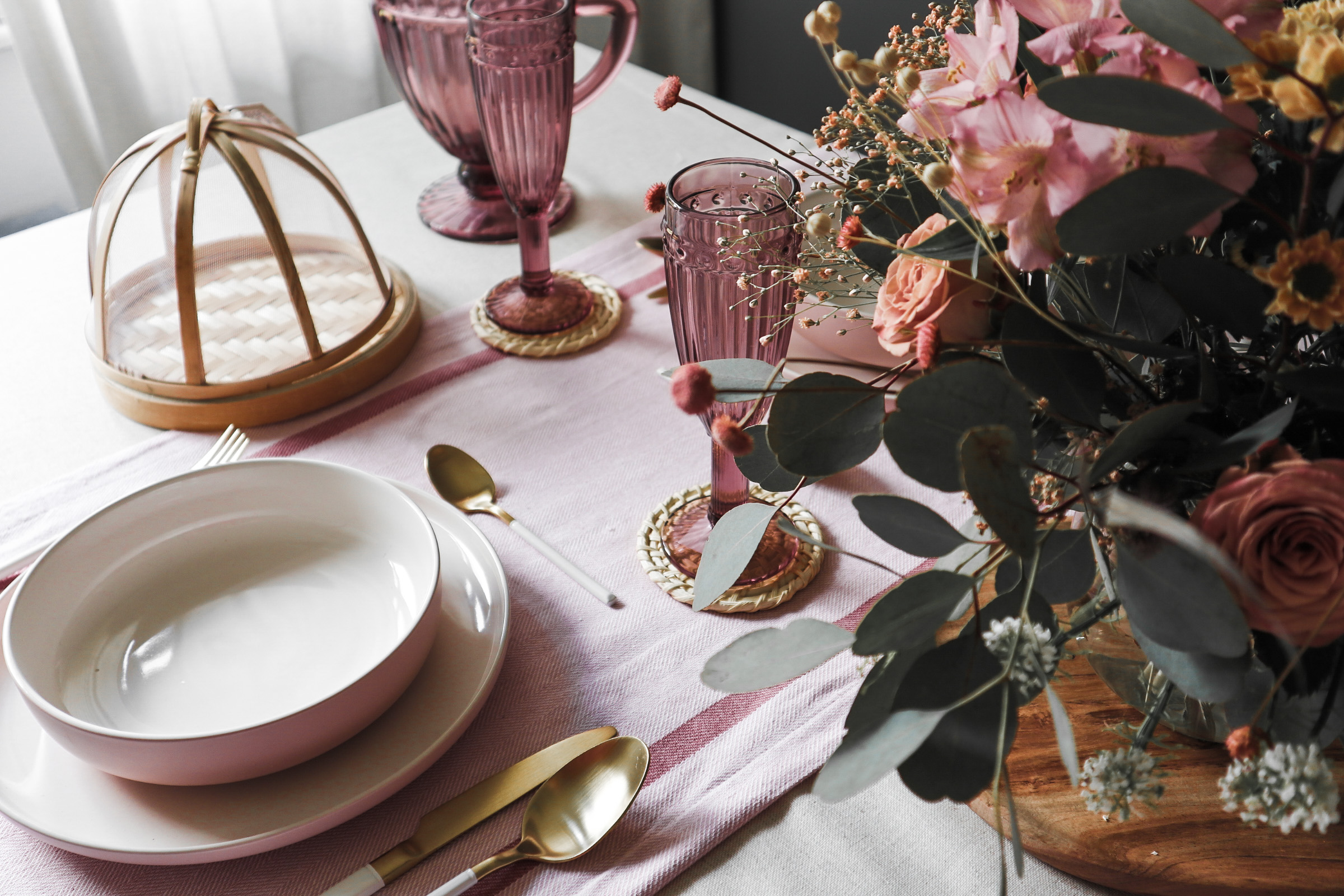 Tako je nastal romantičen pogrinjek, ki sem ga dodatno popestrila s čudovitim priborom v beli in zlati barvi, dodala še svež šopek v preprosti stekleni vazi in nekaj naravnih elementov. Vključila sem še tekač, je pa pogrinjek sam po sebi že dovolj glasen in če želite preprostejši rezultat, lahko uporabite samo enostaven prt brez tekača.