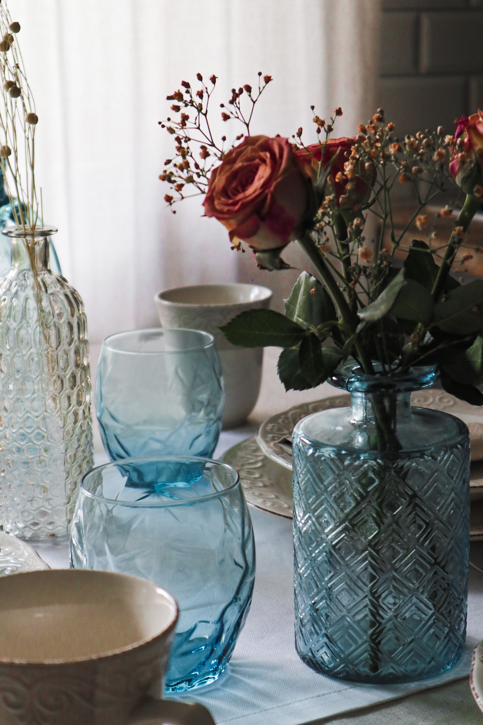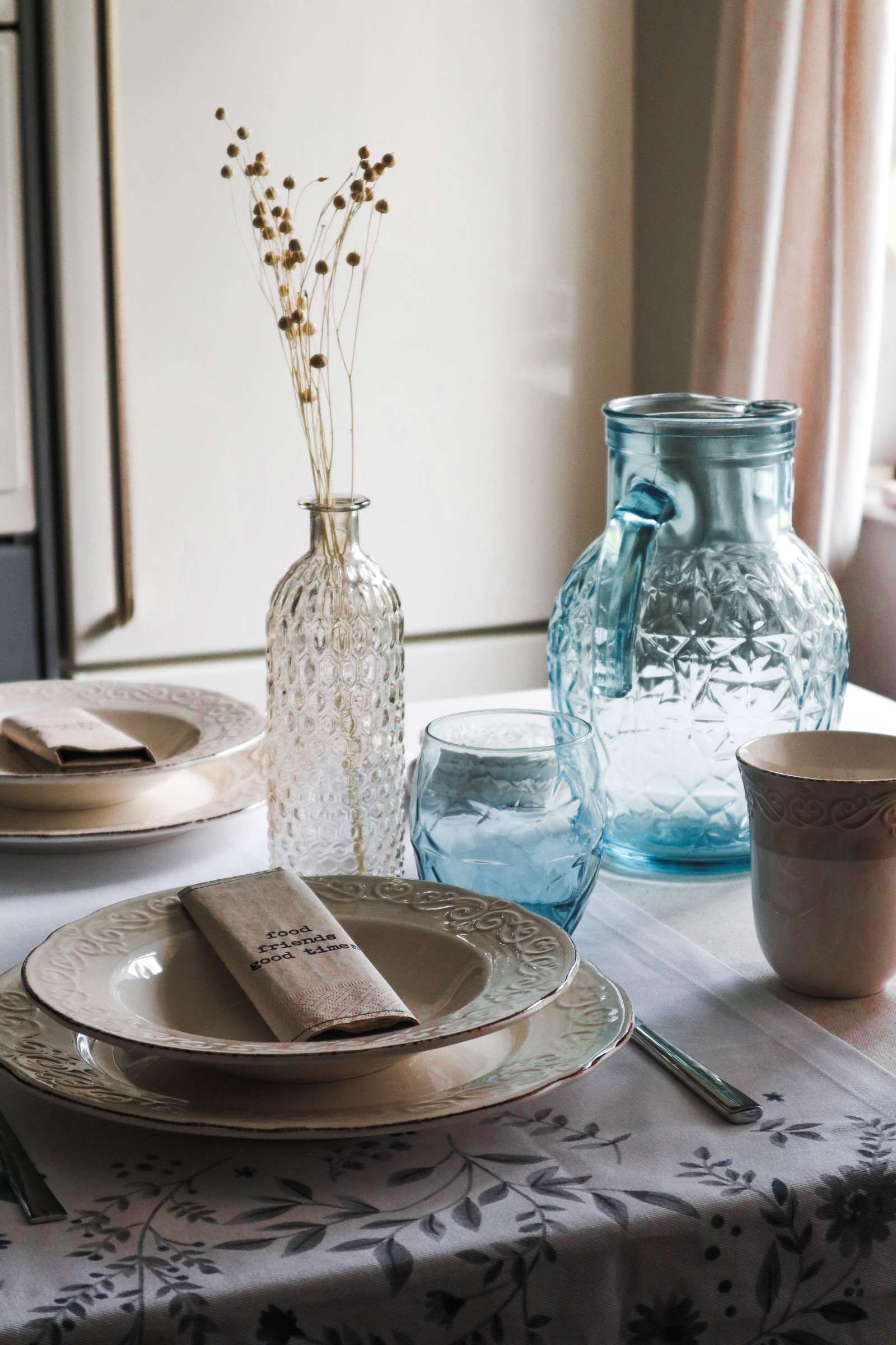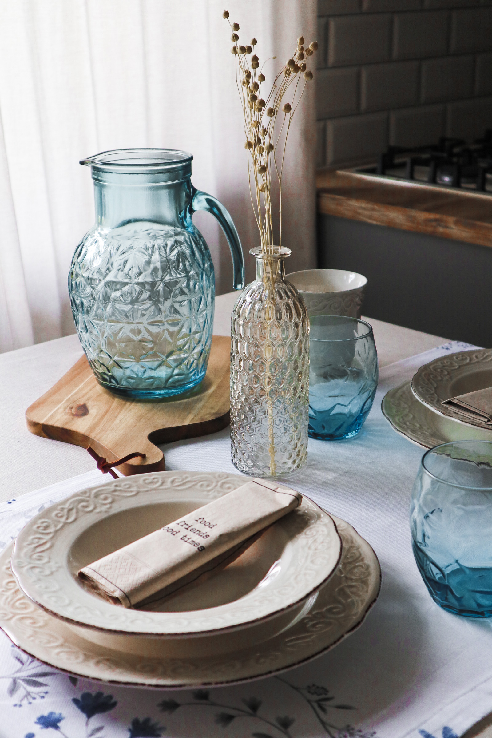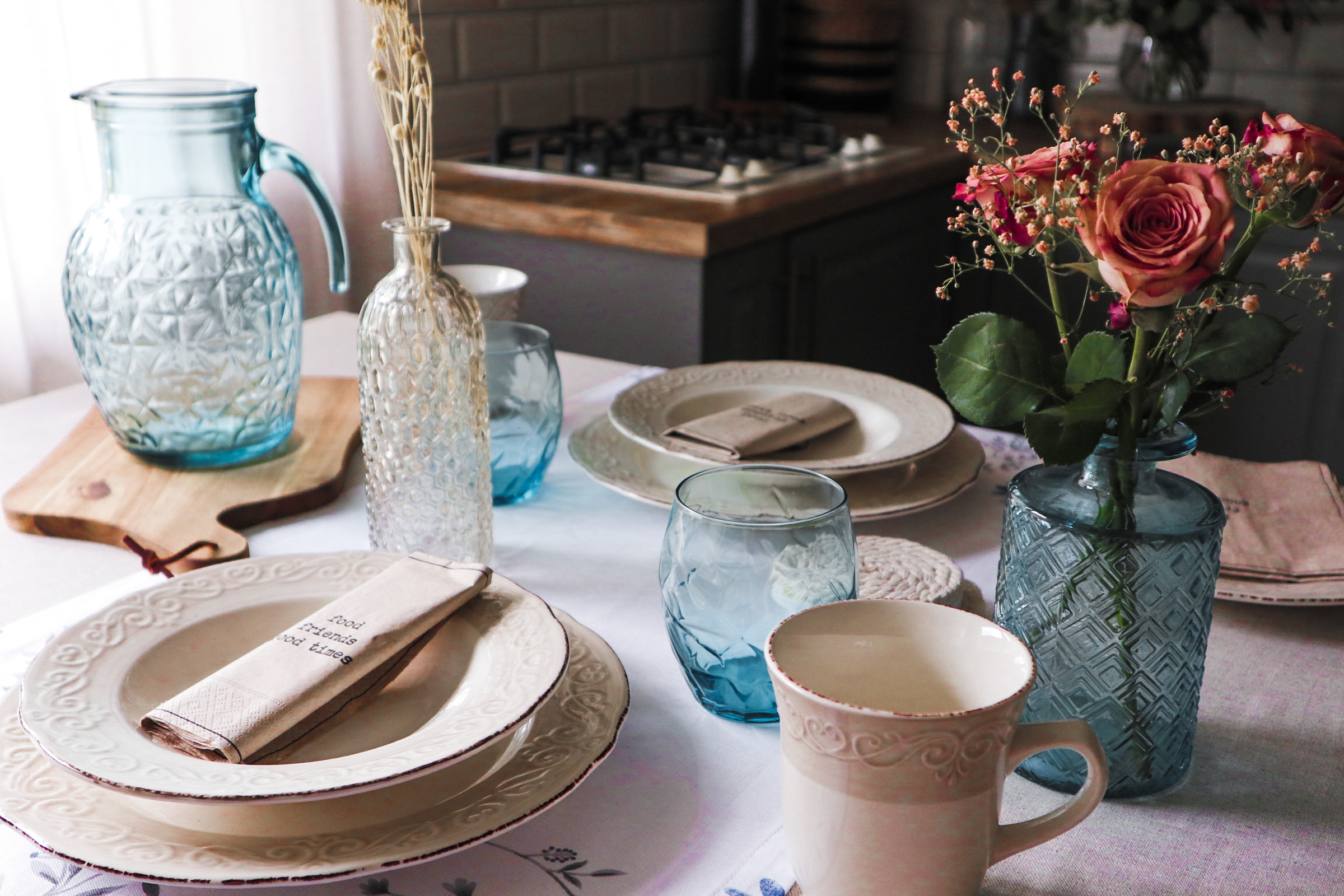 Če se odločimo za ta stil pogrinjka, ne moremo zgrešiti. Kremni rustikalni servis je klasika, ki nam bo služila še vrsto let. Popestrila sem ga z modro barvo in tako dobila lepo kombinacijo, ki z mornarskimi barvami že kliče po poletju. Za klasičen stil sem izbrala tudi klasičen WMF pribor, leseno desko za kakšne prigrizke, manjše steklene vazice in tekač s subtilnim rožastim vzorcem.