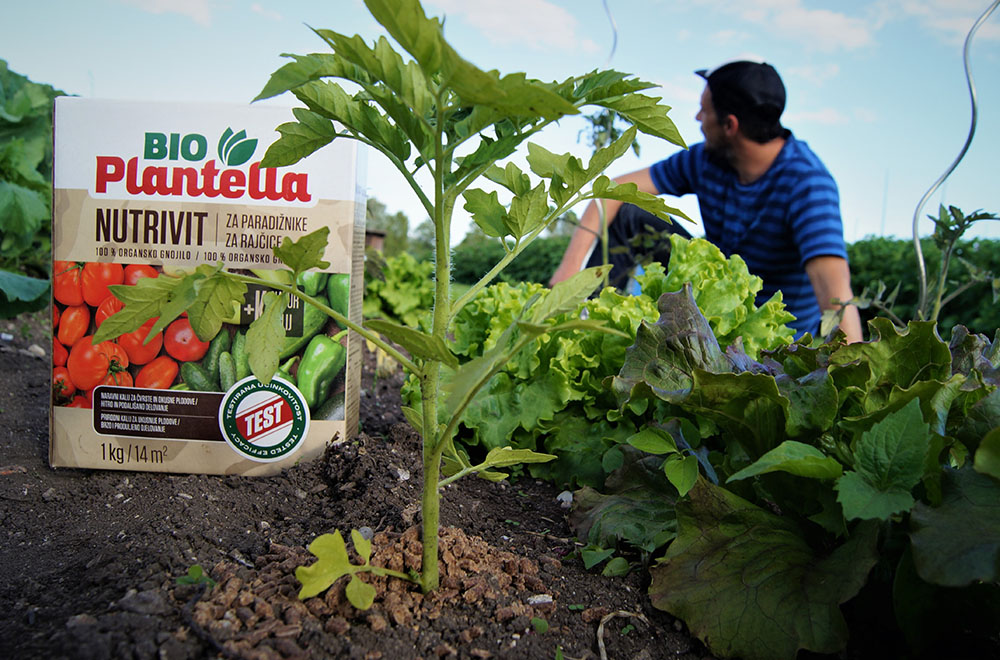 Ob sajenju v sadilno jamico natresemo organsko gnojilo v granulah Bio Plantella Nutrivit za paradižnike, ki ima sestavo, posebno prilagojeno paradižniku in ostalim plodovkam s poudarkom na kaliju (K).