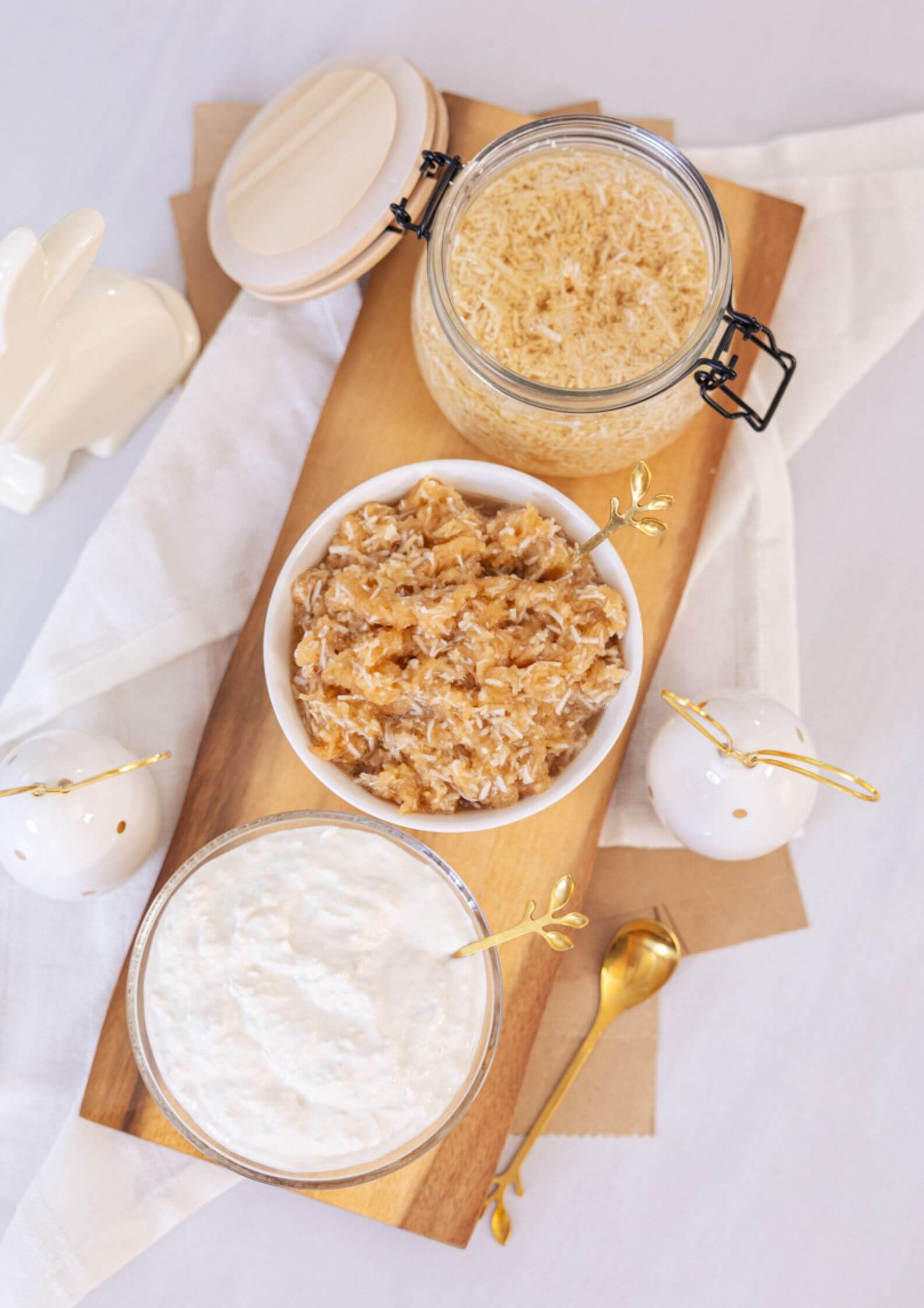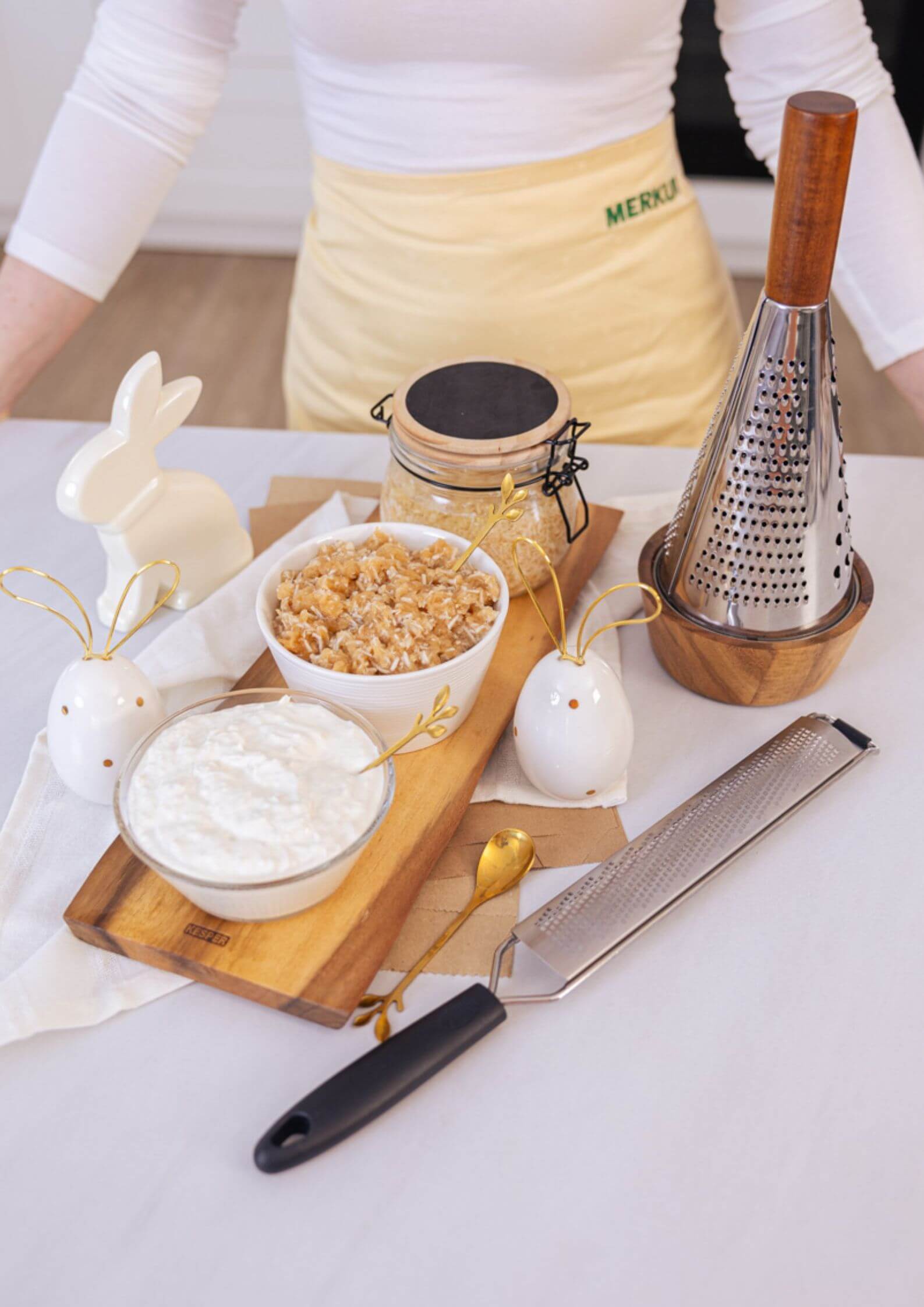 Hren naribamo, nato pa ga z vsemi ostalimi sestavinami dobro zmešamo in direktno postrežemo ali shranimo v hladilnik za kasneje.