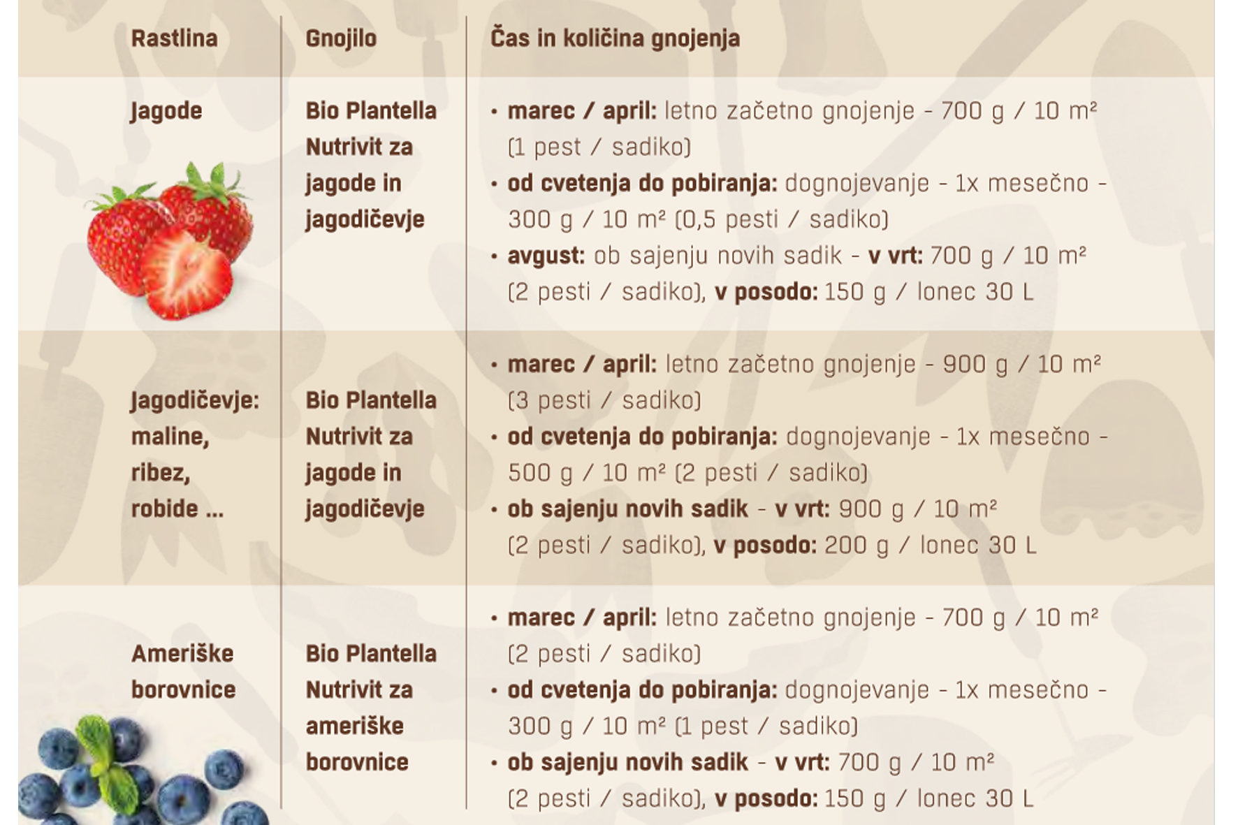 Za jagode, maline, robide ... je najbolje uporabljati specialno organsko gnojilo Bio Plantella Nutrivit za jagode in jagodičevje . Gre za popolnoma naravno gnojilo, dovoljeno tudi v ekološki pridelavi. Vsebuje veliko organske snovi in huminske ter fulvo kisline, s čimer pospešuje nastajanje humusa. Tla ohranja rodovitna, polna življenja, a tudi rastlini zagotovi vsa hranila, ki jih potrebuje, da obrodi veliko okusnih sadežev.