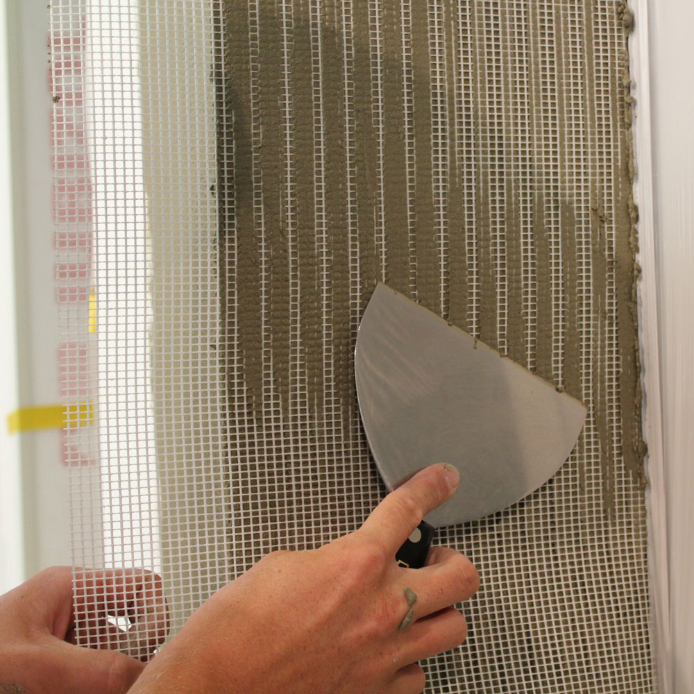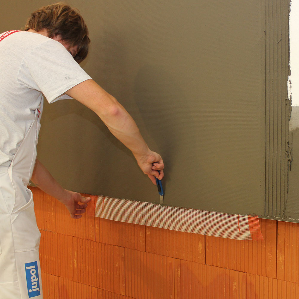 Z uporabo armirne mrežice se zmanjšujejo napetosti, ki se pojavijo na fasadi in preprečujejo krčenje ter raztezanje. Najprej malto nanesete na ustrezno pripravljeno podlago. Mrežico vstavite v sveže naneseno malto za armiranje v navpičnih ali vodoravnih pasovih brez gub. Vedno začnete na najvišji etaži delovnega odra. Posamezne pasove mrežice prekrivate s preklopom najmanj 10 cm. Da bi zagotovili zadostno pokritje, morate vstavljeno mrežo prekriti z malto za armiranje, ko je ta še mokra.