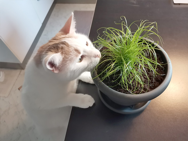 Mačke so mesojede živali, ki pa potrebujejo “zeleni priboljšek” za izboljšanje prebave. Najbolje je, da mačkam ponudimo užitne rastline, kot je mačja trava (Cyperus alternifolius ‘Zumula’). Tako hišni ljubljenčki pustijo pri miru ostale sobne rastline in ne delajo škode.