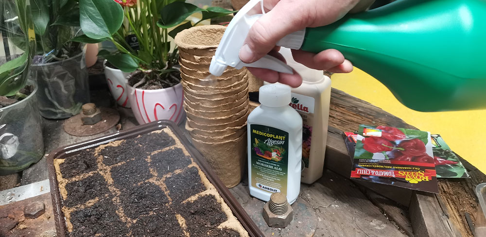 Priporočljivo je, da zemljo po setvi poškropite s pršilko in tako preprečite škodo, ki jo majhnim rastlinam povzroči prekomerna nasičenost z vodo. Vodi za pršenje dodajte morske alge za boljšo kalitev in ukoreninjanje.