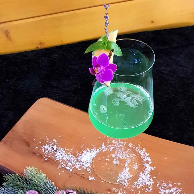 Kozarec za vino ohladimo z ledom. Zmešamo 1 dl belega vina, dodamo polovico merice jabolčnega soka in polovico merice metinega sirupa. Dobro premešamo in iz kozarca odstranimo led in ga prelijemo v kozarec. Dodamo merico radenske in merico tonika. Okrasimo z melono in svežim cvetom.
