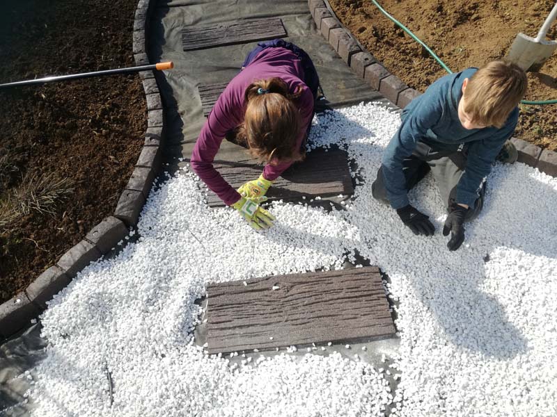 Vrtno pot najlažje uredimo z uporabo obrob iz reciklirane gume. Takšne obrobe v vrtu ne gnijejo in jih lahko poljubno upogibamo. Svojemu namenu lahko tako služijo še vrsto let. Naš vrt pa je dostopen tudi v copatih. Pri delu lahko sodeluje cela družina in skupaj ustvarja, preživlja aktiven prosti čas. Za postavitev obrobe potrebujemo filc, pesek različnih granulacij, lubje, lopato, grablje, škarje, desko za niveliranje in nekaj dobre volje.