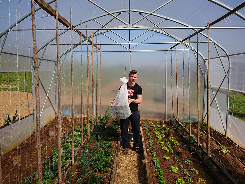 Če še niste sejali in sadili v rastlinjak pohitite. V našem rastlinjaku imamo na desni strani solato, redkvico, mlad česen, grah, peteršilj. V aprilu bomo ob kole na opori in mrežo usmerili kumare. Desni rob bo v začetku aprila zasedel še nizek fižol. Na levi strani rastlinjaka rastejo jagode, čebula, špinača, zgodnji krompir ter azijska listna zelenjava. Sejali smo tudi tržaški solatnik. Za kolobarjenje bomo naslednje leto samo zamenjali strani.