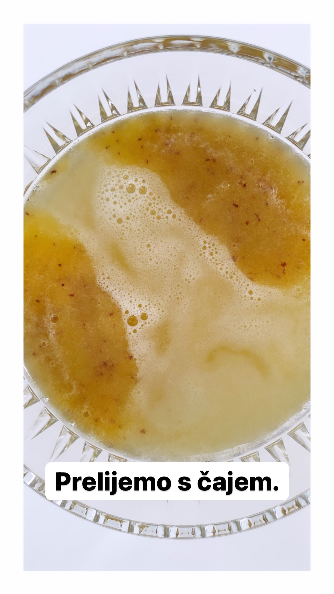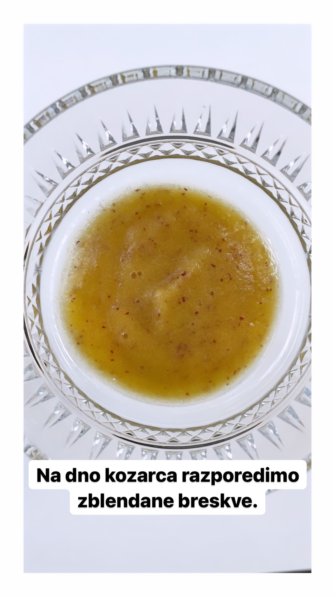 Priprava: Najprej pripravimo bezgov čaj - suho bezgovo cvetje prelijemo z vrelo vodo in pustimo stati 15 min, ohladimo, oziroma ga pripravimo po navodilih na embalaži. Breskev narežemo na koščke in jo zmečkamo z vilico ali zblendamo.