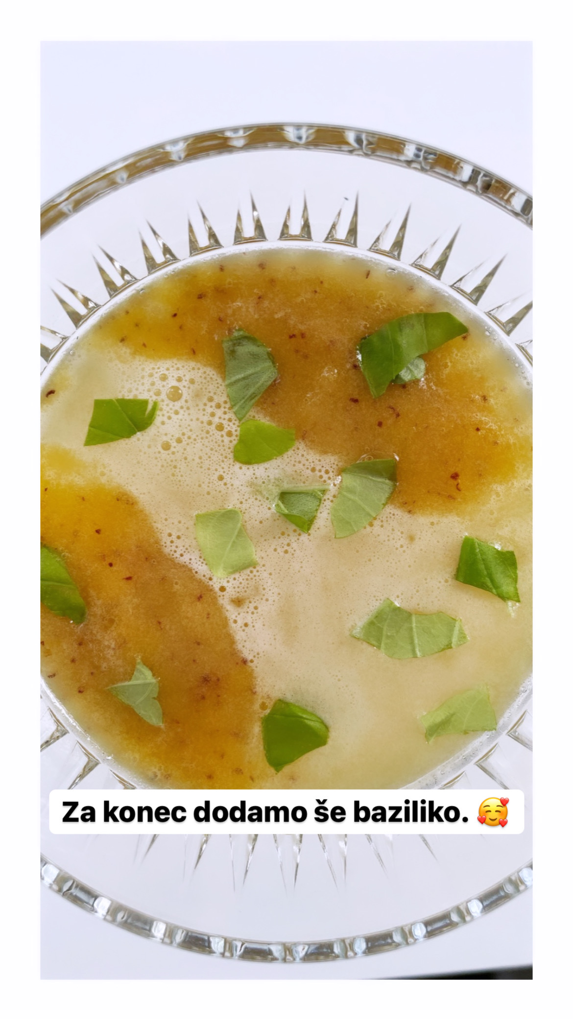 Če ste bolj sladkosnedi, dodajte sladilo bo izbiri. Priporočam, da izberete med, javorjev sirup, stevijo, sadni sok. Vse skupaj premešajte in lahko za nekaj časa postavite v hladilnik, lahko pa postrežete takoj. Seveda po želji dodamo še malo ledu. Kozarec po želji okrasimo z rezino breskve in/ali vršičkom bazilike.