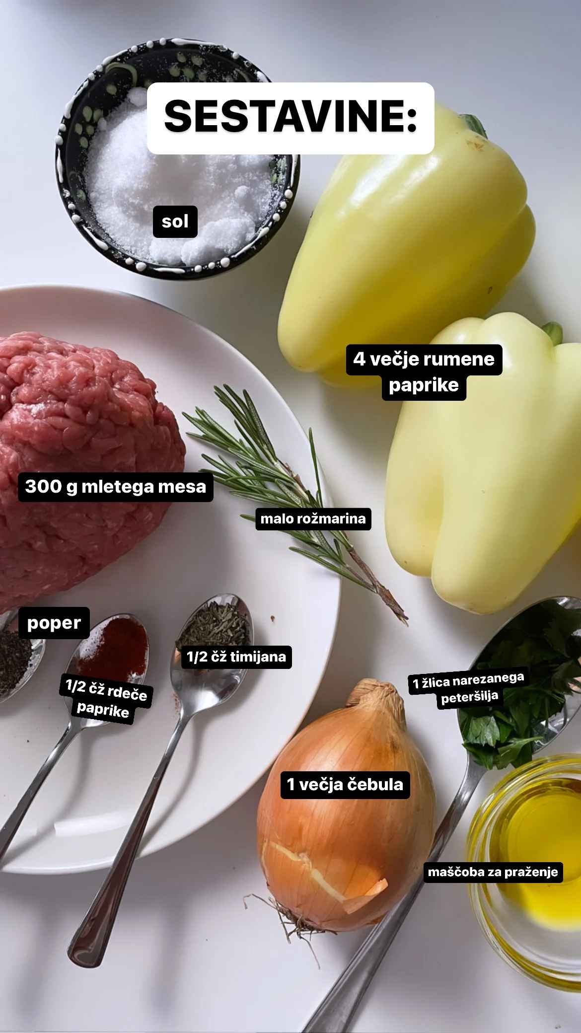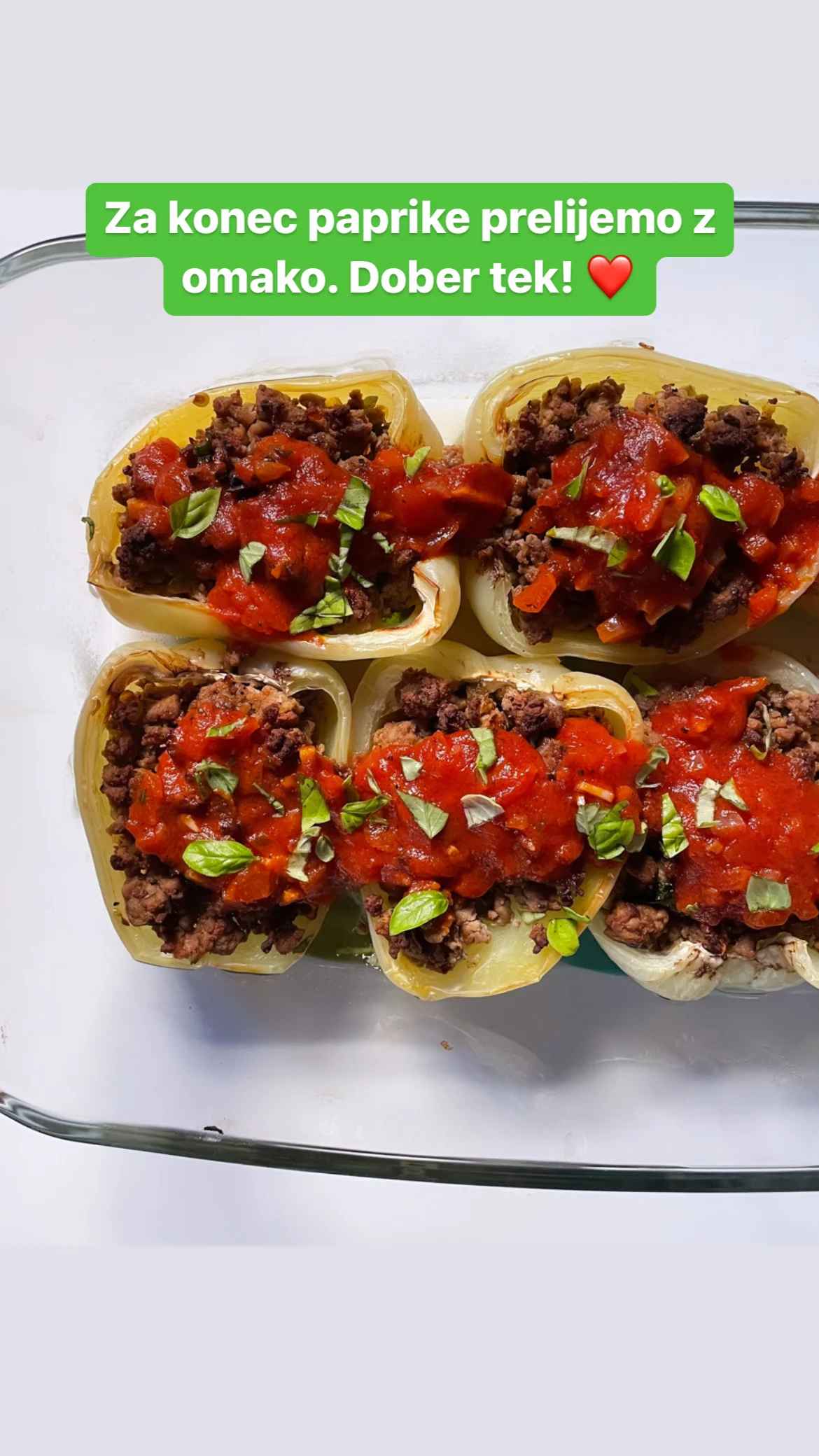 Medtem, ko se meso praži, prerežemo paprike na polovice in jih očistimo. Polovice zložimo na pekač in jih napolnimo s pripravljenim mletim mesom.