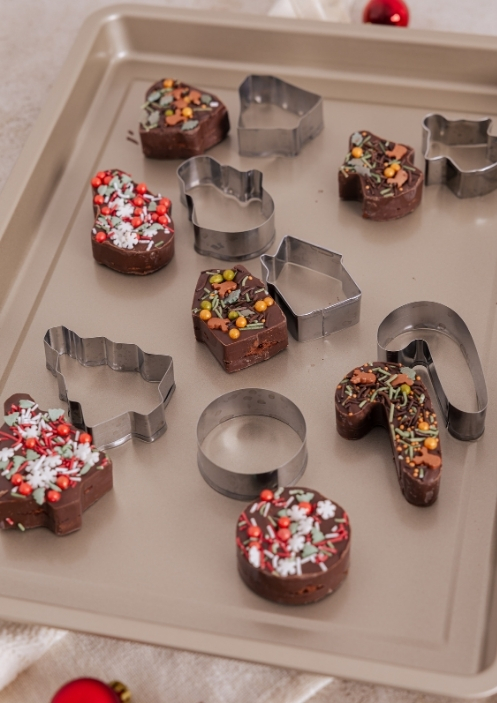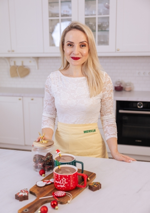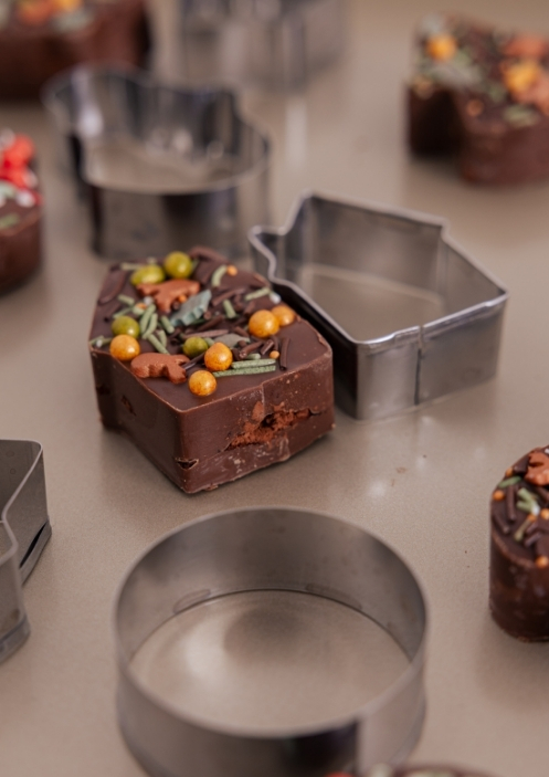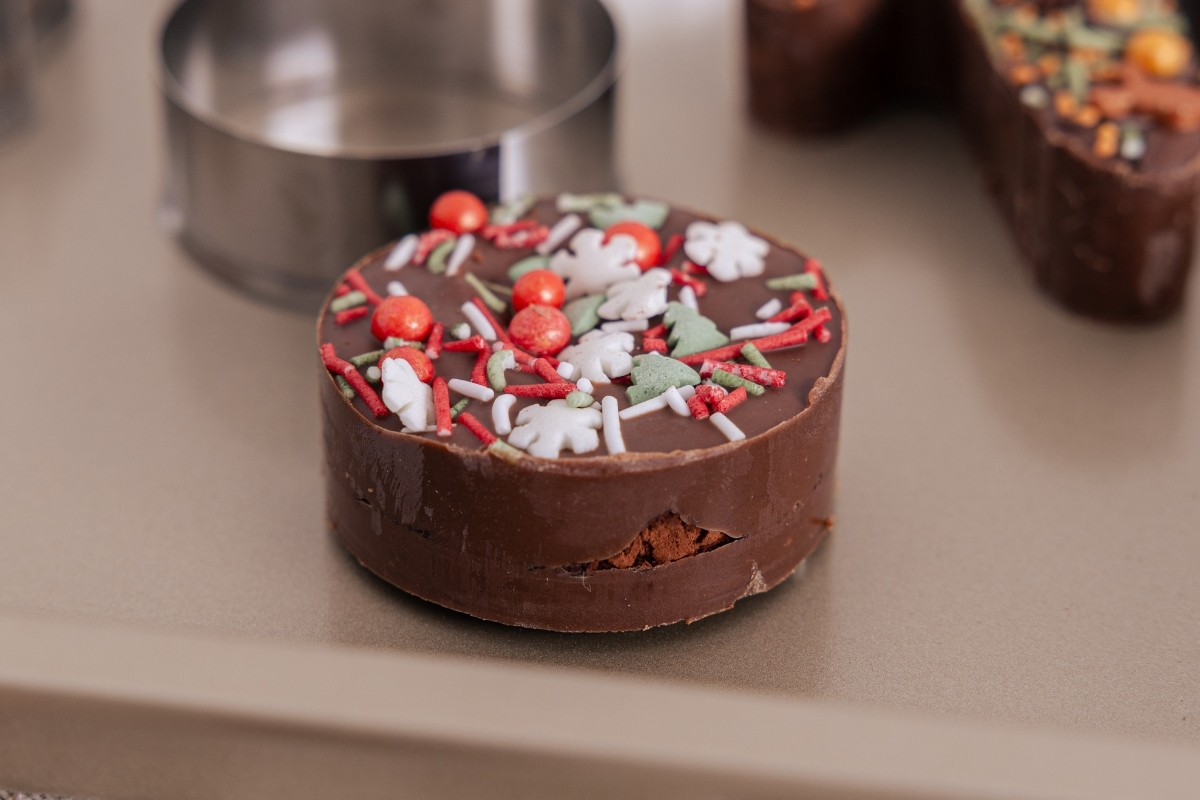 Z njo pokrijemo spodnji del prazničnih modelčkov. Na sredino dodamo kakav. Pokrijemo s čokolado. Potresemo s prazničnimi okraski.