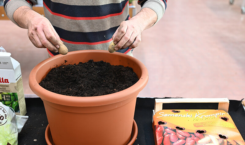 V posodi sadimo 2 gomolja zgodnjih sort krompirja in to v posodo z volumnom 20 litrov. Pri sajenju poznih sort sadimo samo en gomolj. Pri nas ga sadim tako, da gomolj postavimo na sredino posode in do vrha nasujemo zemljo, ki jo obogatimo z gnojilom.
