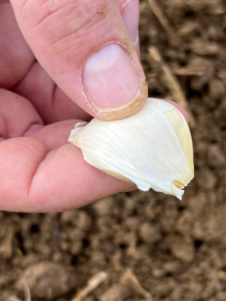 Za najboljši pridelek česna na vrtu, ki ga gojimo za glavni pridelek, sadimo debele zunanje stroke. Razdalja v vrsti je okrog 10 cm, med dvema vrstama pa 30 cm.