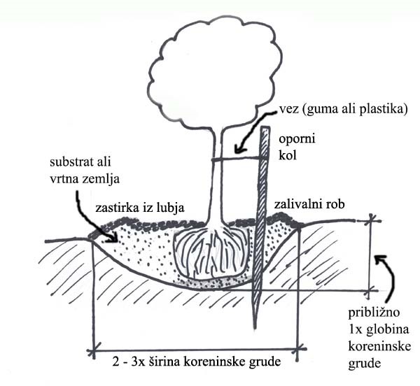 Sadilna jama naj bo dva do tri krat širša, kot je koreninski sistem sadike, ter nekoliko globlja od koreninske grude drevesa.