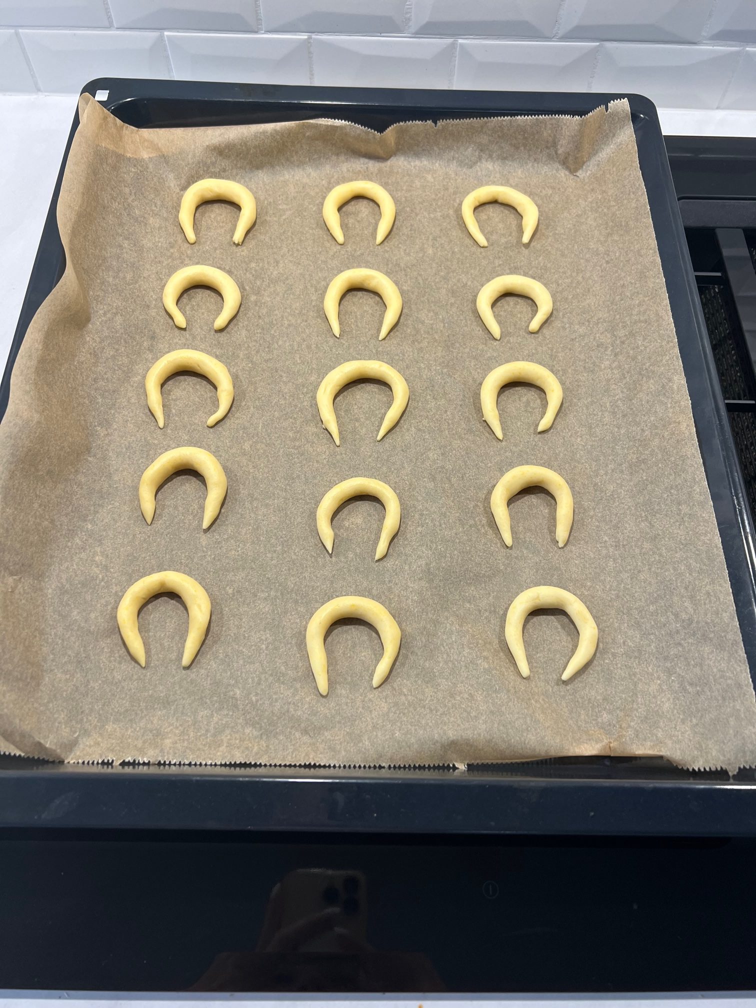 - Razdelimo ga na 4 dele in vsak del posebej oblikujemo v svaljek, iz katerega narežemo in oblikujemo rogljičke.