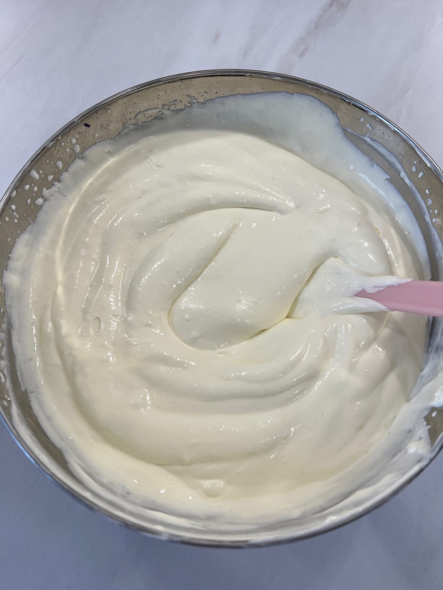 - Dodamo tudi limonin sok in z metlico dobro zmešamo, da se puding in smetana lepo združita.