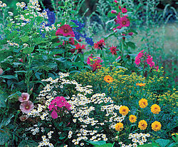 Skupen nastop - Monarda, vinska rutica, slez, pasja kamilica in ognjič si delijo gredico s plamenko, suholetnico in z lepo očko.