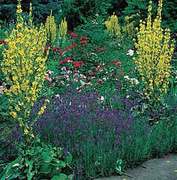 Sončevi sli - Modrocvetna sivka in velikocvetni lučniki so kakor krona gredice z vrtnicami. Poznamo več vrst velikocvetnega lučnika Verbascum, z rumenimi cvetovi).