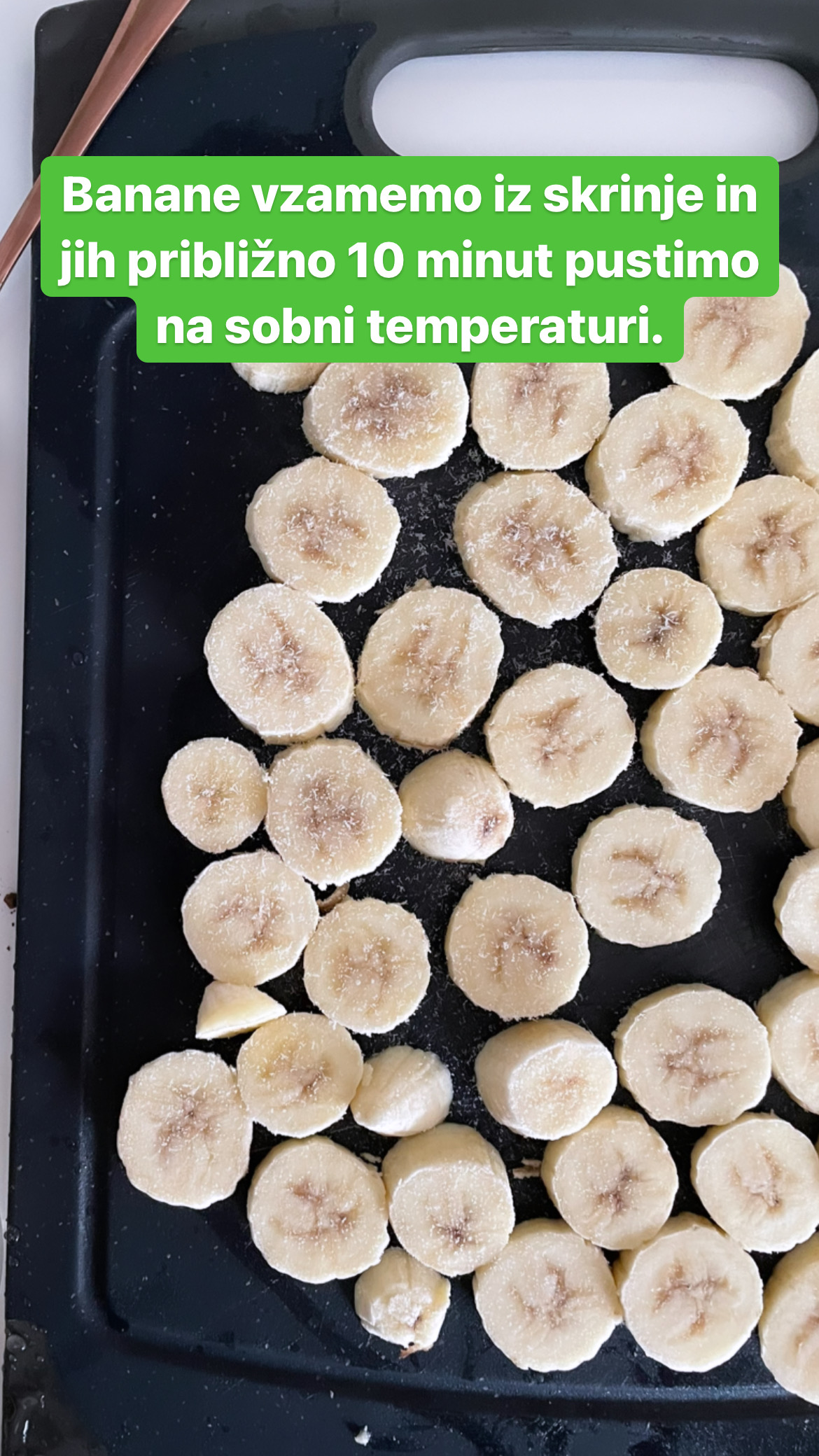 Res lepo zrele banane olupimo in narežemo na približno 1 cm debele kolobarje (debelejši zamrznjeni kosi, so lahko prevelik izziv za blender), razporedimo na pladenj ali plastičen pokrov in zamrznemo. Zamrznjene lahko stresemo v vrečko in imamo pripravljene za takrat, ko se nam zazdi, da bi sladoled.