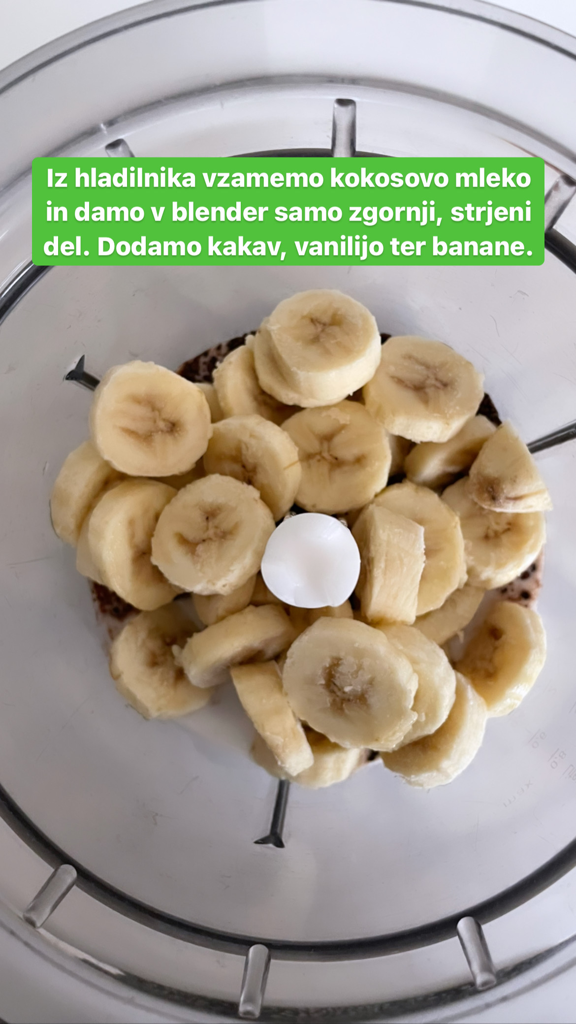 Banane vzamemo iz skrinje in jih približno 10 minut pustimo na sobni temperaturi. Iz hladinika vzamemo kokosovo mleko in damo v blender samo zgornji, strjeni del. Dodamo kakav (količina je odvisna od okusa – lahko date več ali manj) in vanilijo, ter banane. Vse skupaj dobro zblendamo, da dobimo lepo gladek in kremast sladoled – pomagamo si tako, da ves čas porivamo sestavine proti nožem (to delamo s posebnim pripomočkom, ki ga dobimo pri blenderju, ker se nikakor ne smemo dotakniti nožev).