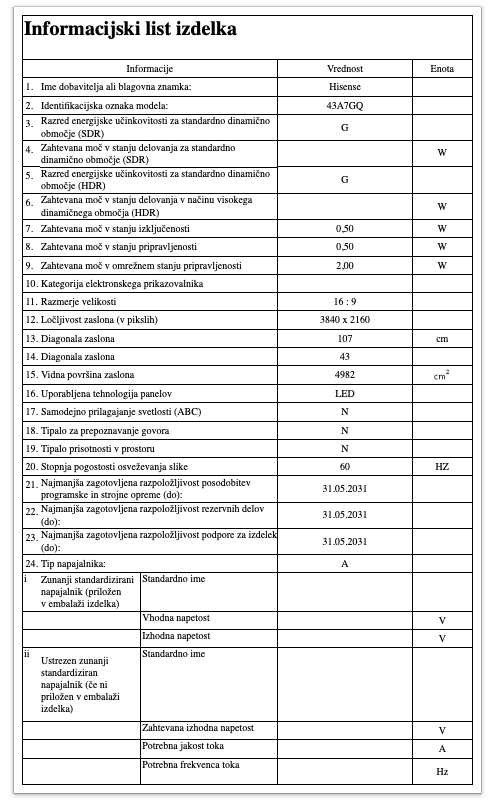 Blagovna znamka HISENSE TEHNOLOGIJA ZASLONA LED LCD INTERNET TV SMART TV DIAGONALA ZASLONA 108 CM LOČLJIVOST ZASLONA 3840 X 2160 ENERGIJSKI RAZRED G BREZŽIČNA POVEZAVA WI-FI ENERGIJSKI RAZRED (HDR) G PORABA ENERGIJE - SDR (1000UR) 51 KWH PORABA ENERGIJE - HDR (1000UR) 65 KWH GARANCIJA V LETIH 2 LETI - Mnenja
