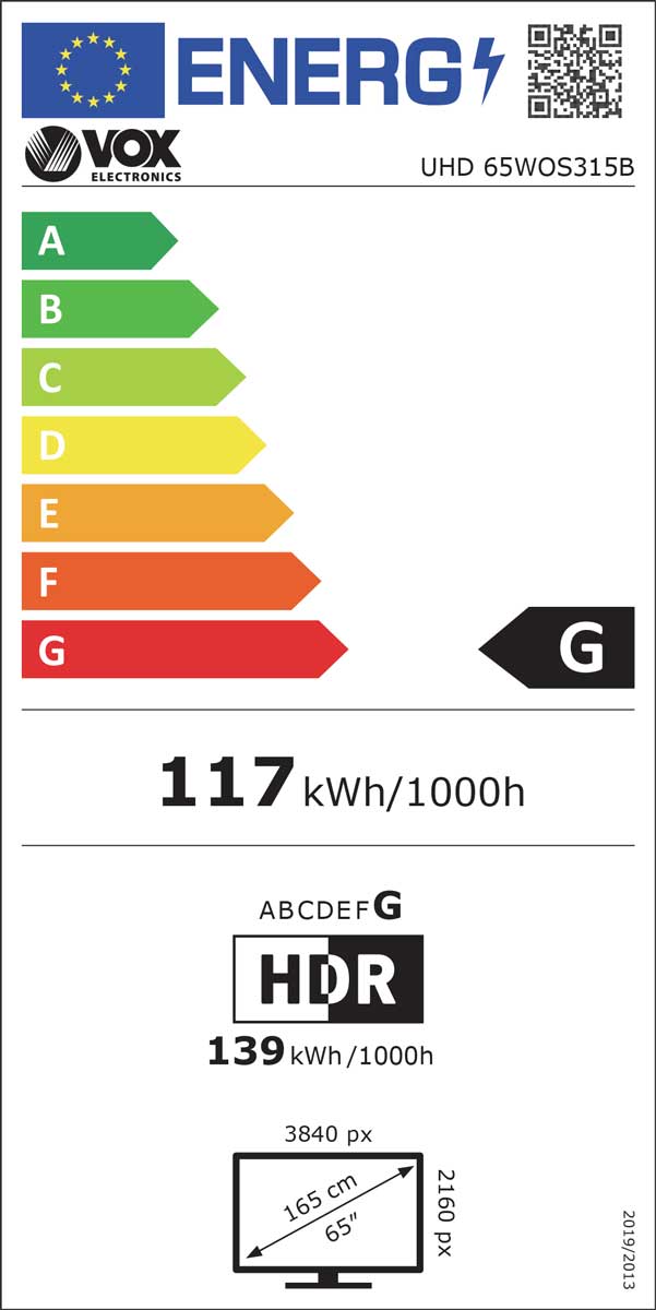 Blagovna znamka VOX TEHNOLOGIJA ZASLONA LED LCD INTERNET TV SMART TV DIAGONALA ZASLONA 164 CM LOČLJIVOST ZASLONA 3840 X 2160 AMBILIGHT NE ENERGIJSKI RAZRED (HDR) G ENERGIJSKI RAZRED G BREZŽIČNA POVEZAVA WI-FI PORABA ENERGIJE - SDR (1000UR) 117 KWH PORABA ENERGIJE - HDR (1000UR) 139 KWH GARANCIJA V LETIH 3 LETA -
