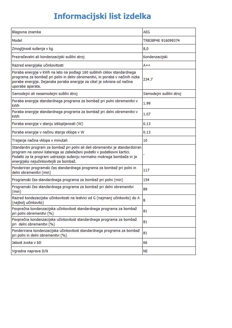SUŠILNI STROJ AEG TR838P4E TOPLOTNA ČRPALKA