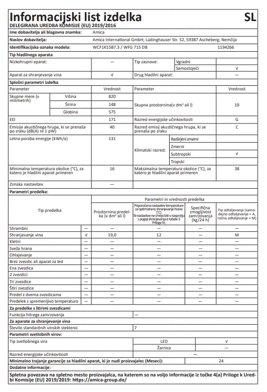 Blagovna znamka AMICA ENERGIJSKI RAZRED G VRSTA HLADILNIKA VINSKA VITRINA LETNA PORABA ELEKTRIČNE ENERG. 131 KWH TEMPERATURNO OBMOČJE OD 5 DO 20 °C TEMPERATURNA OBMOČJA 1 LOČENO NASTAVLJIVI HLAD. KROG 1 ŠIRINA 14,8 CM GLOBINA 57,5 CM ŠT. STANDARDNIH STKLENIC VINA 6 BARVA ČRNA INVERTERSKI KOMPRESOR NE KLIMATSKI RAZRED ST: +18 DO +38°C EMISIJA HRUPA 40 DB RAZRED EMISIJE HRUPA C ODPIRANJE VRAT LEVO/DESNO POVEZLJIVOST WI-FI NE VIŠINA 82 CM GARANCIJA V LETIH 2 Mnenja