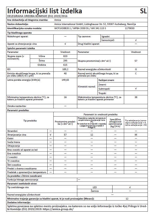 Blagovna znamka AMICA ENERGIJSKI RAZRED G VRSTA HLADILNIKA VINSKA VITRINA LETNA PORABA ELEKTRIČNE ENERG. 150 KWH TEMPERATURNO OBMOČJE OD 5 DO 20 °C TEMPERATURNA OBMOČJA 1 LOČENO NASTAVLJIVI HLAD. KROG 1 ŠIRINA 29,5 CM GLOBINA 61,5 CM ŠT. STANDARDNIH STKLENIC VINA 20 BARVA ČRNA - STEKLENA VRATA INVERTERSKI KOMPRESOR NE KLIMATSKI RAZRED ST: +18 DO +38°C EMISIJA HRUPA 40 DB RAZRED EMISIJE HRUPA C MATERIAL POLIC LESENE ODPIRANJE VRAT LEVO/DESNO POVEZLJIVOST WI-FI NE VIŠINA 82 CM GARANCIJA V LETIH 2 Mnenja