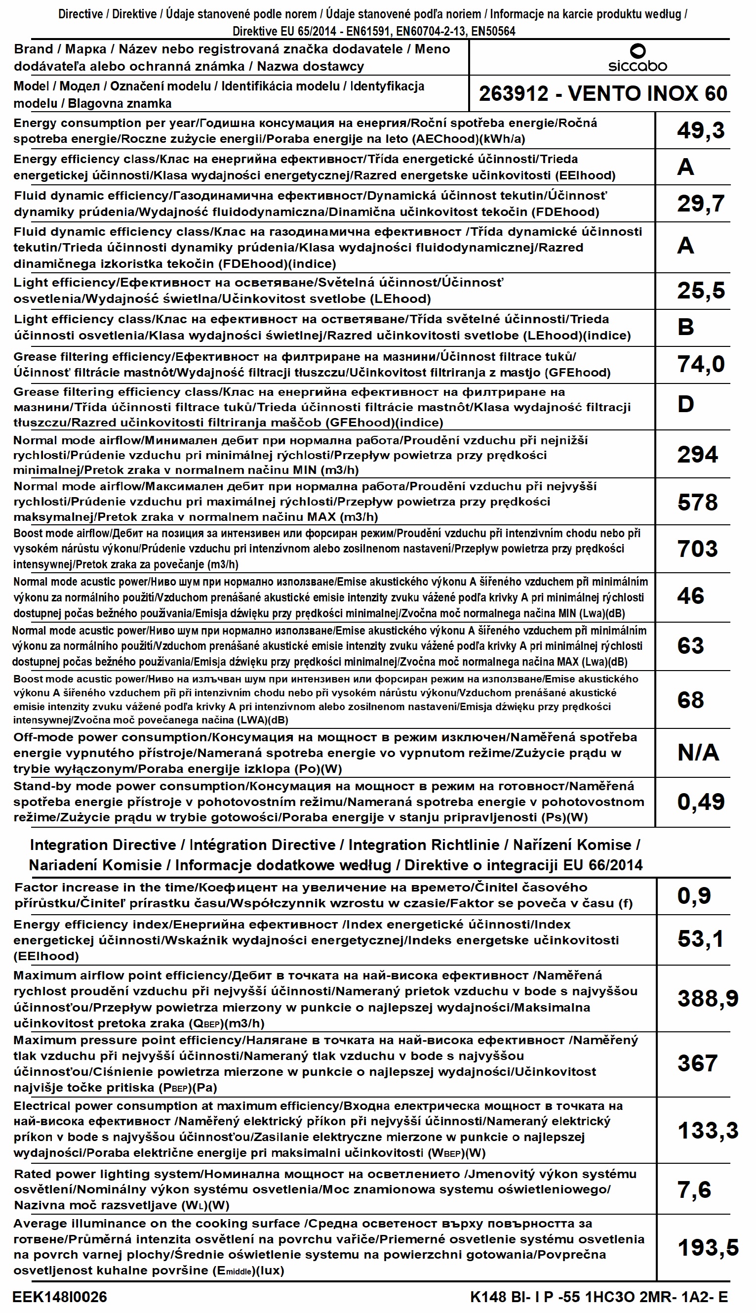 Siccabo kuhinjska napa VENTO je vgradna kuhinjska napa, ki s svojo učinkovitostjo spada v energijski razred. Ima aluminijast maščobni filter, ki ga preprosto operete v pomivalnem stroju enkrat na tri mesece. Je visoko učinkovita, z največjim pretokom zraka do 730 m3/h, glasnostjo med 48 in 69 dBA in kakovostno LED-osvetlitvijo. Upravljate jo z gumbi na dotik. Vgradna kuhinjska napa je na voljo v inox barvi, v dimenziji 60cm. Mogoče je dokupiti ogleni filter in tako ne potrebujete odvoda zraka iz prostora, ampak preprosto filtrirate zrak znotraj kuhinje.