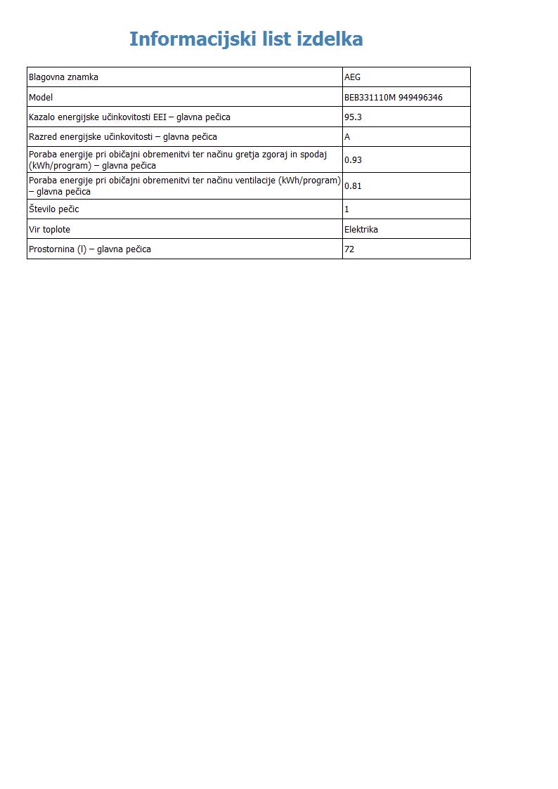 Blagovna znamka AEG VRSTA VGRADNE PEČICE VGRADNA PEČICA PROSTORNINA 71 L UPRAVLJANJE DISPLAY S PRIKAZOM BESEDILA Z GUMBI VRSTA PEČICE VEČFUNKCIJSKO ŠIRINA 59,5 CM VIŠINA 59,4 CM GLOBINA 56,7 CM NAČIN ČIŠČENJA AQUACLEAN GLASNOST DELOVANJA 47 DB POVEZLJIVOST WI-FI NE ENERGIJSKI RAZRED A GARANCIJA V LETIH 2 DOD.JAMSTVO/POGOJI GARANTA/LET 3 -