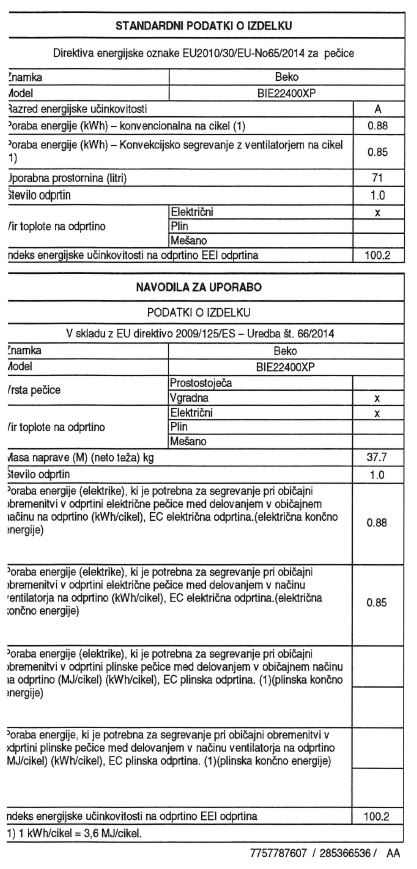 Blagovna znamka BEKO ENERGIJSKI RAZRED A VRSTA VGRADNE PEČICE VGRADNA PEČICA PROSTORNINA 71 L UPRAVLJANJE ELEKTRONSKO VRSTA PEČICE VENTILACIJSKO ŠTEVILO PROGRAMOV 10 ZASTEKLITEV VRAT TROJNA ŠIRINA 59,4 CM NAČIN ČIŠČENJA PIROLIZA GLOBINA 56,7 CM POVEZLJIVOST WI-FI NE VIŠINA 59,5 CM GARANCIJA V LETIH 5 LET Mnenja