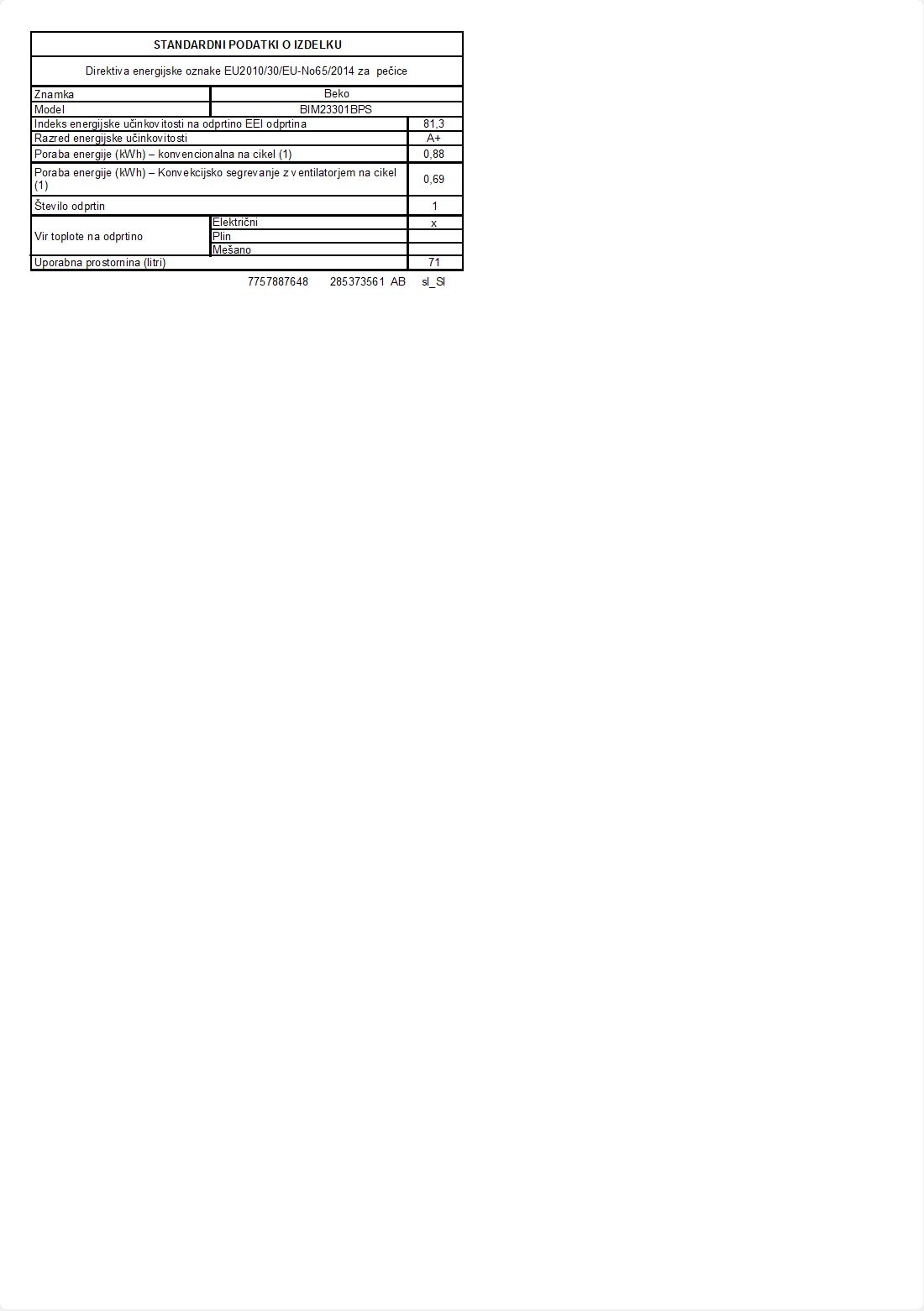 Blagovna znamka BEKO VRSTA VGRADNE PEČICE VGRADNA PEČICA PROSTORNINA 71 L UPRAVLJANJE ELEKTRONSKO VRSTA PEČICE VENTILACIJSKO ŠIRINA 59,4 CM ZASTEKLITEV VRAT ŠTIRIKRATNA VIŠINA 59,5 CM GLOBINA 56,7 CM NAČIN ČIŠČENJA PIROLIZA POVEZLJIVOST WI-FI NE ENERGIJSKI RAZRED A+ GARANCIJA V LETIH 2 LETI -