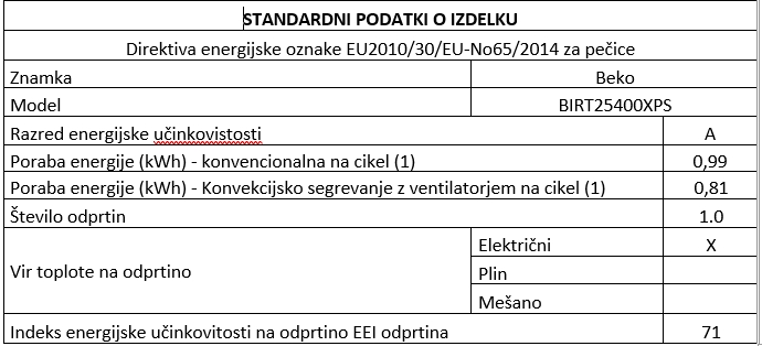 Vgradna pečica Beko BIRT25400XPS se ponaša s pirolitičnim čiščenjem, 15 programi peke, med katerimi izstopa tehnologija prostorske peke ? Surf, ventilacijska peka, hladnimi vrati ? štirikratna zasteklitev vrat, hladilnim ventilatorjem, programom za odmrzovanje in ohranjanje toplote, elektronskim upravljanjem in osvetlitvijo notranjosti. Vgradna pečica omogoča tudi peko s pomočjo vrtljivega ražnja, žara in peko pice, elektronska varnostna ključavnica pa preprečuje spreminjanje programov in odpiranje vrat med uporabo. Priloženi so 1 plitek, 1 globok pekač, mrežna rešetka in enonivojska izvlečna vodila. Se iz vaše pečice kadi in širi neprijeten vonj? To pomeni, da morate zavihati rokave in se lotiti čiščenja. Toda to lahko hitro spremenite. Predstavljamo vam pirolitično samo-čiščenje, ki zagotavlja popolno čiščenje težko dostopnih delov notranjosti. Izbirate lahko med 120 minutnim postopkom čiščenja, ki je namenjen čiščenju trdovratne umazanije, pri manj umazani pečici pa se lahko odločite za 90 minutni ekološki pirolitični postopek, s katerim boste privarčevali do 25 odstotkov energije. Med postopkom čiščenja se notranjost pečice segreje do 480 °C, kar umazanijo pretvori v prah. Vse, kar morate po končanem postopku storiti, je, da z vlažno krpo brez uporabe čistilnih sredstev obrišete ostanke. Ura je zgodna in vsi še spijo, vi pa čutite neustavljivo željo po pripravi okusnega zajtrka za svoje najbližje. Hvaležno odprete vrata svoje nove pečice, saj ste izbrali takšno z mehkim, elegantnim in neslišnim zapiranjem vrat. Zdaj lahko kuhate neslišno kot miška, vaši domači pa vam bodo za nekaj minut dodatnega spanja zagotovo neizmerno hvaležni.
