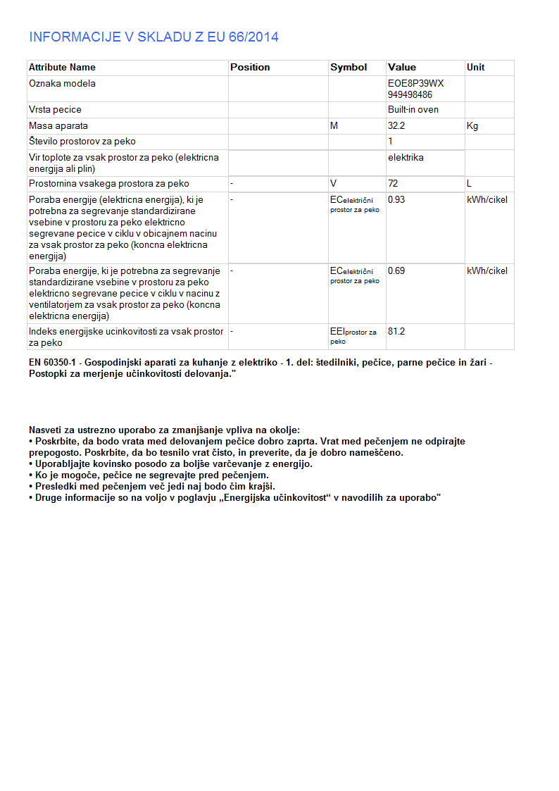 Vgradna pečica Electrolux EOE8P39WX prostornino 72 l, sodi v energijski razred A+. Z možnostjo enakomernega pečenja na vseh stopnjah, je vsa hrana enakomerno pečena, brez obračanja. Funkcija pirolitičnega čiščenja bo ohranilo pečico kot novo.