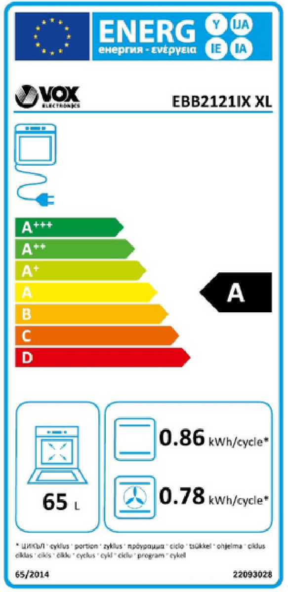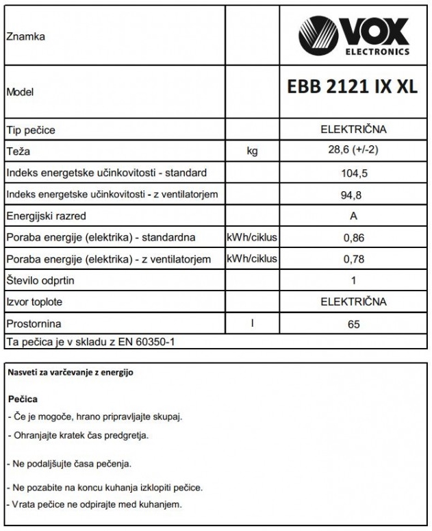 VOX set pečice in kuhalne plošče EBB 2121 IX XL / EBG 310 GIXV setu je vgradna pečica s prostornino 65 litrov.
