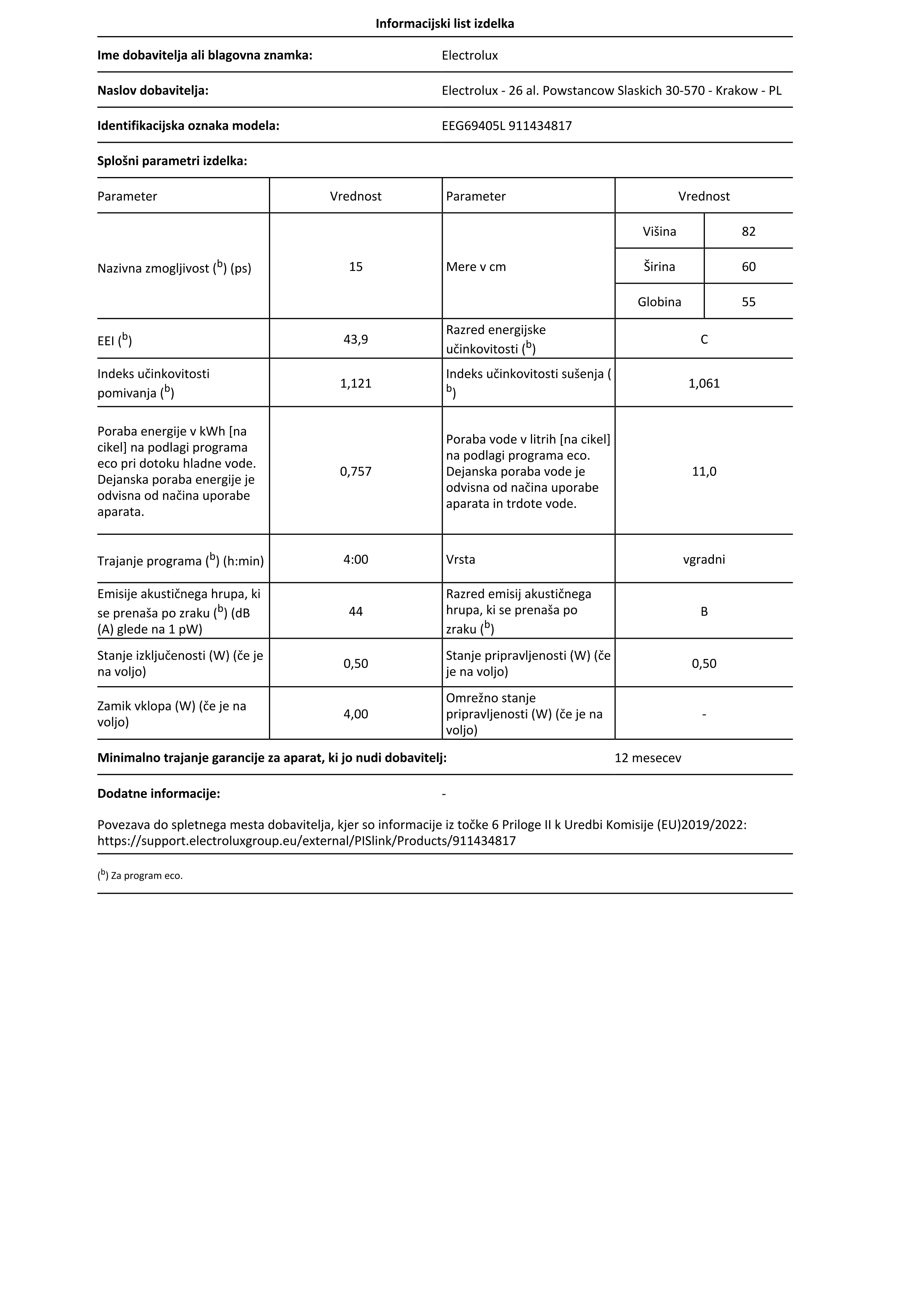 Blagovna znamka ELECTROLUX ENERGIJSKI RAZRED C VRSTA POMIVALNEGA STROJA VGRADNI ŠTEVILO POGRINJKOV 15 PORABA ENERGIJE NA 100 CIKLOV 84 KWH ŠTEVILO PROGRAMOV 8 PORABA VODE NA CIKEL 11 L ŠIRINA 59,6 CM ZAŠČITA PRED IZLIVOM VODE NE GLOBINA 55 CM INVERTER MOTOR DA ŠTEVILO TEMPERATUR 3 TRAJANJE PROGRAMA ECO 4:00 H : MIN ŠIRINA POMIVALNEGA STROJA 60 CM EMISIJA HRUPA 44 DB RAZRED EMISIJE HRUPA B ZAMIK VKLOPA DA POVEZLJIVOST WI-FI NE VIŠINA 81,8 CM GARANCIJA V LETIH 2 DOD.JAMSTVO/POGOJI GARANTA/LET 3 Mnenja