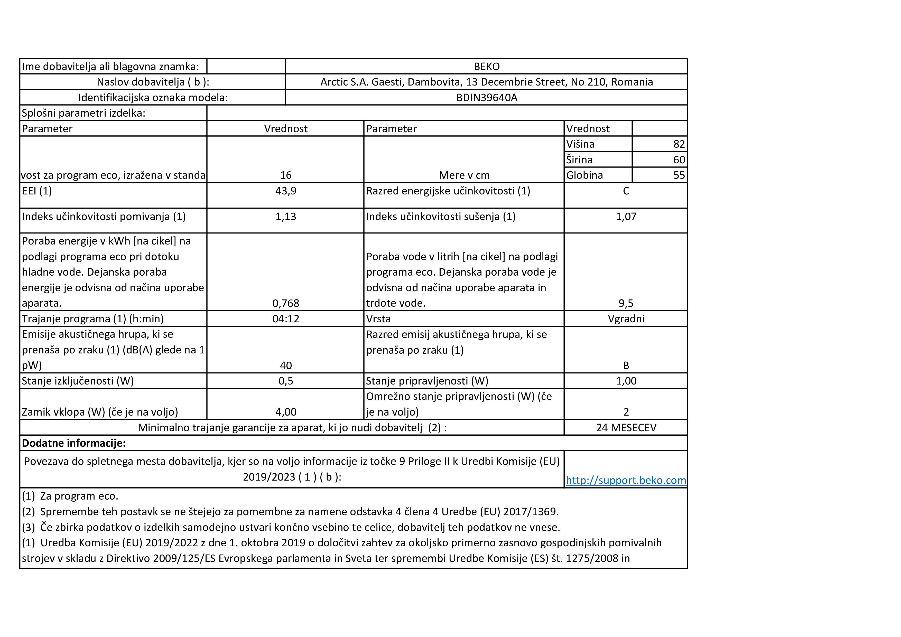 Blagovna znamka BEKO ENERGIJSKI RAZRED C VRSTA POMIVALNEGA STROJA VGRADNI ŠTEVILO POGRINJKOV 16 PORABA ENERGIJE NA 100 CIKLOV 77 KWH ŠTEVILO PROGRAMOV 8 PORABA VODE NA CIKEL 9,5 L ŠIRINA 59,8 CM ZAŠČITA PRED IZLIVOM VODE AQUA STOP GLOBINA 55 CM INVERTER MOTOR DA ŠTEVILO TEMPERATUR 5 TRAJANJE PROGRAMA ECO 4:12 H : MIN ŠIRINA POMIVALNEGA STROJA 60 CM EMISIJA HRUPA 40 DB RAZRED EMISIJE HRUPA B ZAMIK VKLOPA DA POVEZLJIVOST WI-FI NE VIŠINA 81,8 CM GARANCIJA V LETIH 2 LETI Mnenja