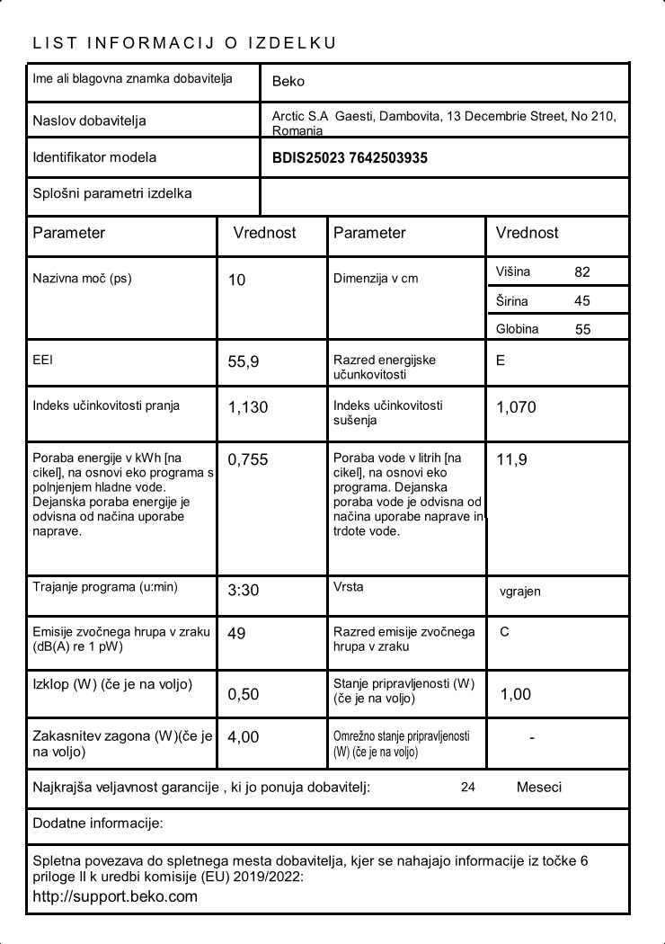 Blagovna znamka BEKO ENERGIJSKI RAZRED E VRSTA POMIVALNEGA STROJA VGRADNI ŠTEVILO POGRINJKOV 10 PORABA ENERGIJE NA 100 CIKLOV 76 KWH ŠTEVILO PROGRAMOV 5 PORABA VODE NA CIKEL 11,9 L ŠIRINA 44,8 CM ZAŠČITA PRED IZLIVOM VODE DA GLOBINA 55 CM INVERTER MOTOR NE ŠTEVILO TEMPERATUR 4 TRAJANJE PROGRAMA ECO 3:30 H : MIN ŠIRINA POMIVALNEGA STROJA 45 CM EMISIJA HRUPA 49 DB RAZRED EMISIJE HRUPA C ZAMIK VKLOPA DA POVEZLJIVOST WI-FI NE VIŠINA 81,8 CM GARANCIJA V LETIH 2 LETI Mnenja