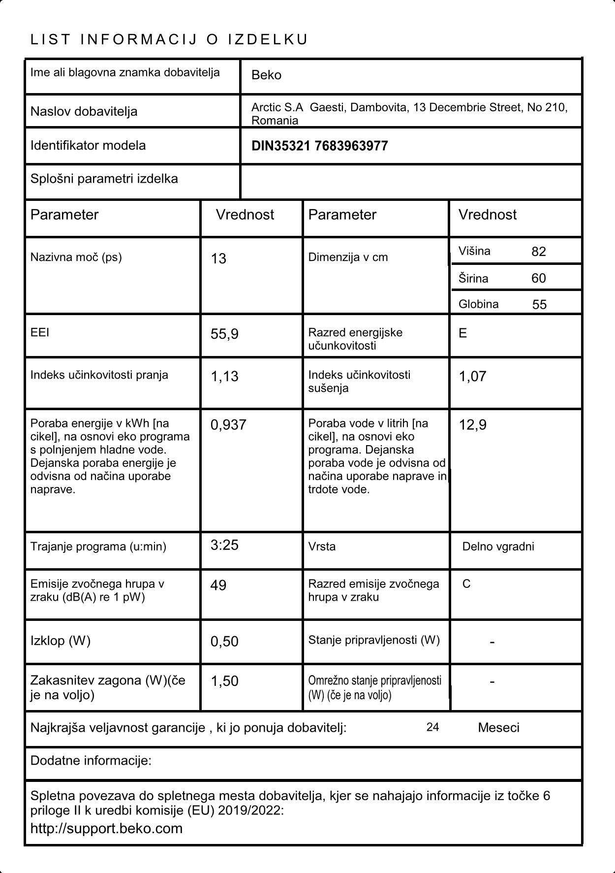 Blagovna znamka BEKO VRSTA POMIVALNEGA STROJA VGRADNI ŠTEVILO POGRINJKOV 13 ŠIRINA 59,8 CM PORABA ENERGIJE NA 100 CIKLOV 94 KWH VIŠINA 81,8 CM ŠTEVILO PROGRAMOV 5 GLOBINA 55 CM PORABA VODE NA CIKEL 12.9 L ZAŠČITA PRED IZLIVOM VODE AQUA STOP INVERTER MOTOR NE ZAMIK VKLOPA DA ŠTEVILO TEMPERATUR 4 POVEZLJIVOST WI-FI NE ENERGIJSKI RAZRED E TRAJANJE PROGRAMA ECO 3:25 H : MIN ŠIRINA POMIVALNEGA STROJA 60 CM EMISIJA HRUPA 49 DB RAZRED EMISIJE HRUPA C GARANCIJA V LETIH 2 LETI - Mnenjačista posoda, bleščeči kozarciUredu izdelek za ta denar.